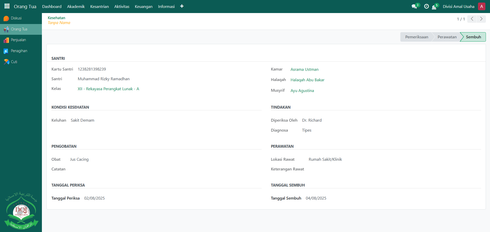 Berikut adalah langkah-langkah untuk memonitoring kesehatan santri pada Odoo Pesantren sebagai orang tua.