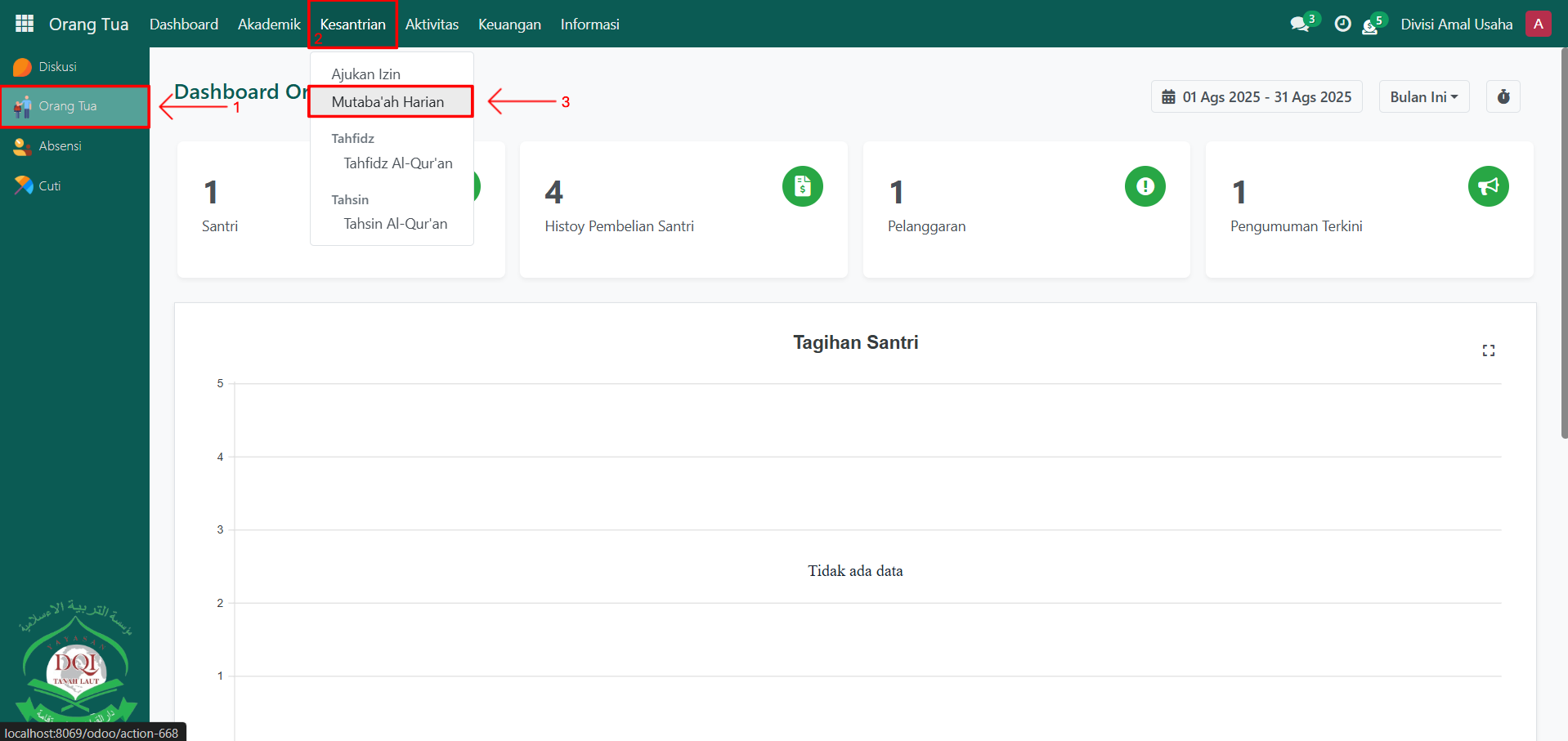 Berikut adalah langkah-langkah untuk memonitoring mutaba'ah harian santri pada Odoo Pesantren sebagai orang tua.