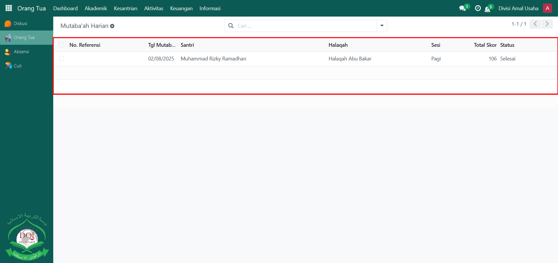 Monitoring Mutaba’ah Harian Santri digunakan oleh Orang Tua untuk memantau aktivitas harian anaknya di pesantren. Melalui fitur ini, orang tua dapat melihat daftar kegiatan mutaba’ah harian yang telah dicatat oleh musyrif dan diverifikasi oleh administrator, sehingga perkembangan aktivitas santri dapat dipantau secara transparan dan real-time.
