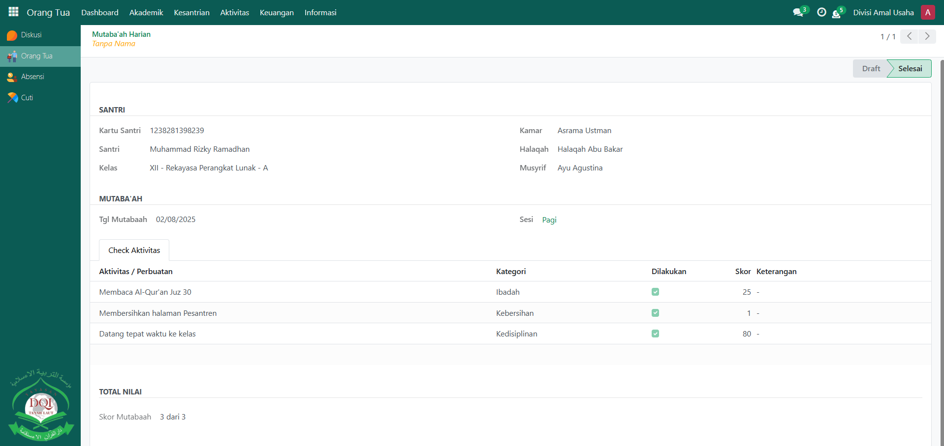 Orang tua dapat memantau hasil pencatatan secara rutin untuk mengetahui perkembangan kedisiplinan dan aktivitas harian anak di pesantren.