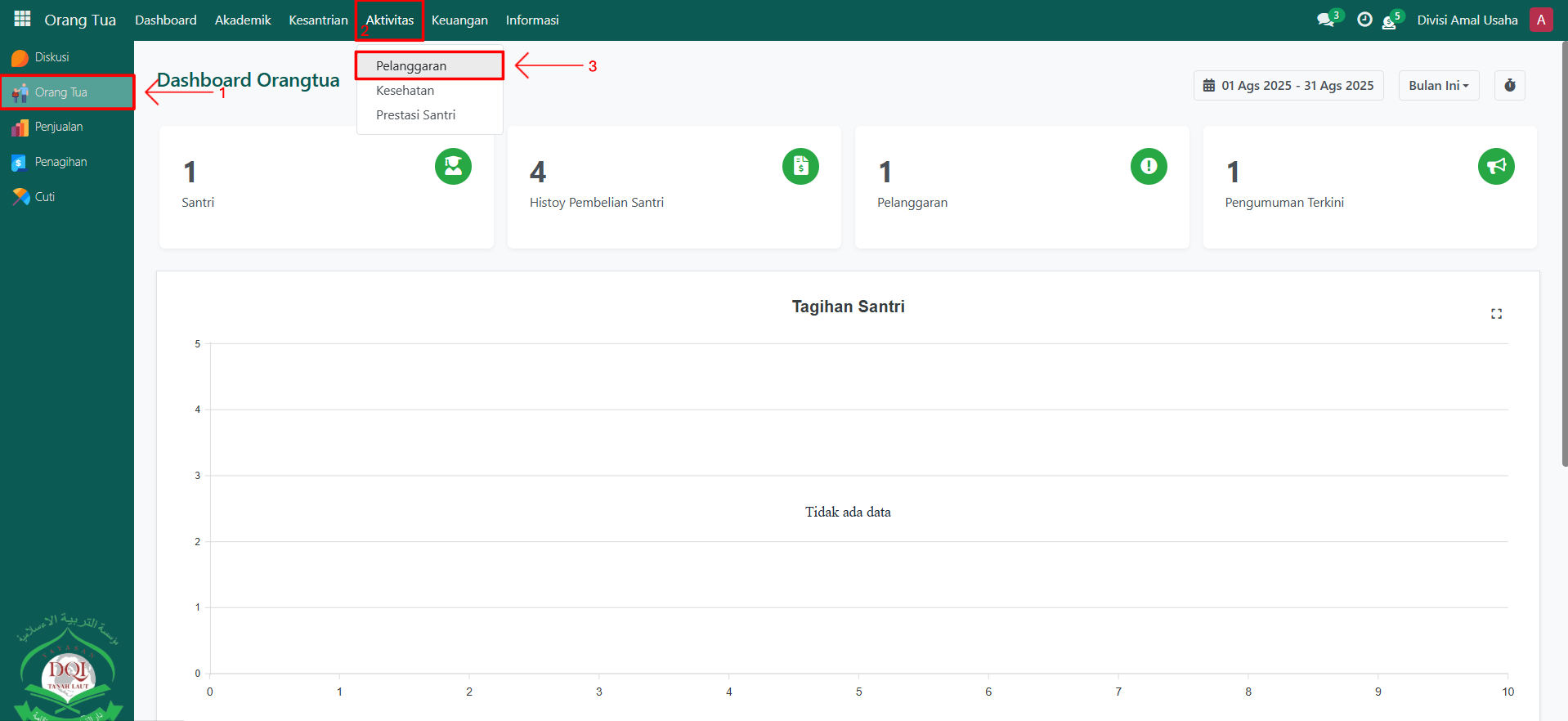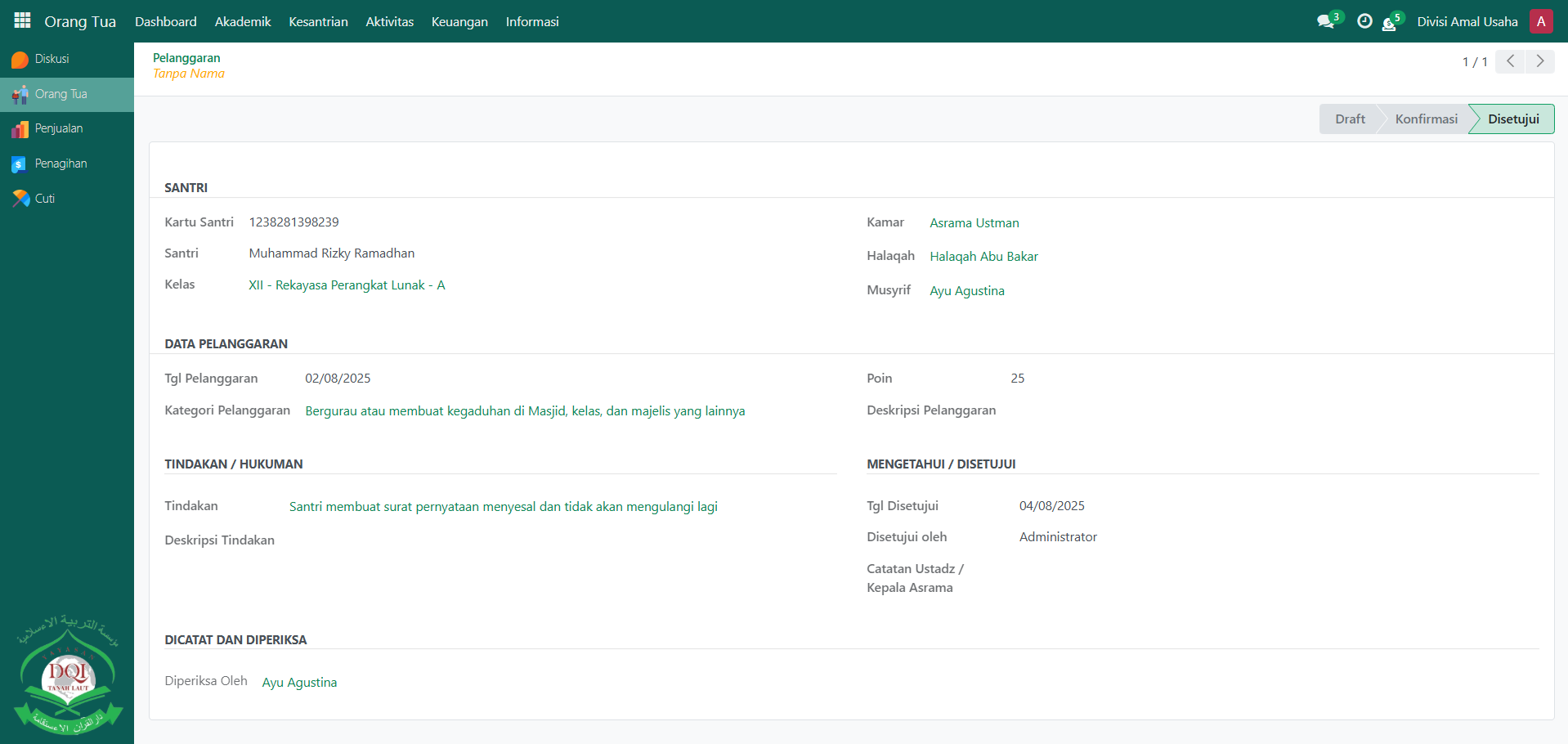 Berikut adalah langkah-langkah untuk memonitoring pelanggaran santri pada Odoo Pesantren sebagai orang tua.