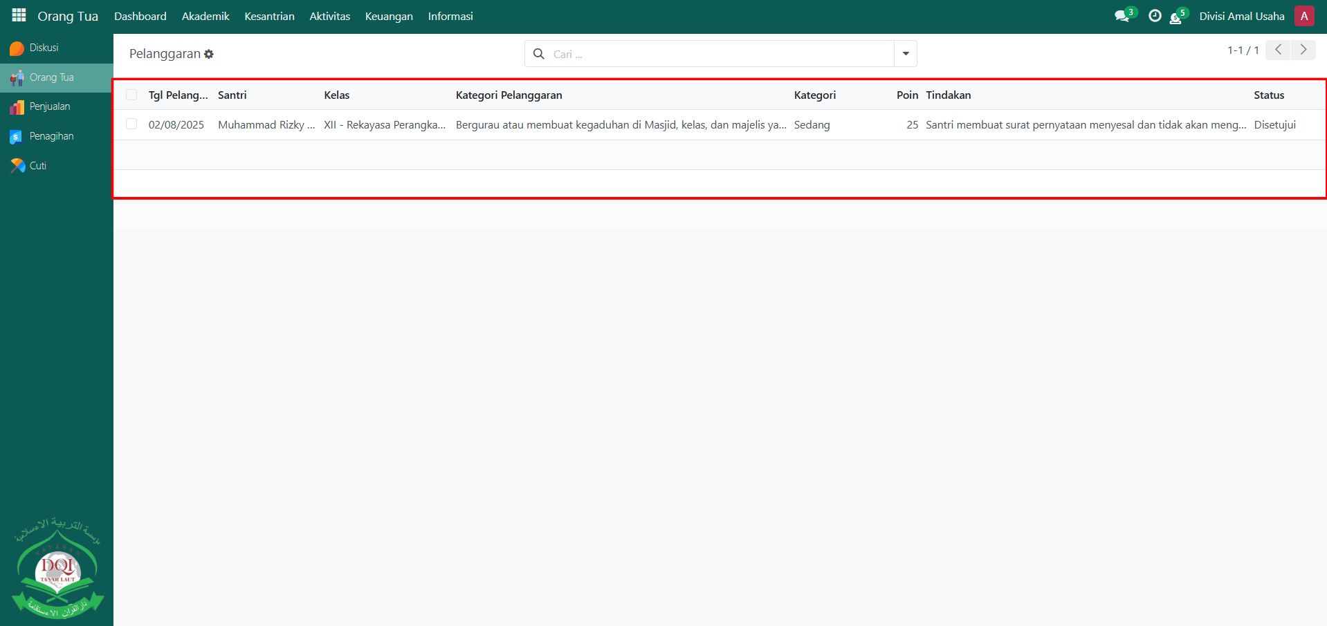 Pada halaman Pelanggaran, sistem akan menampilkan daftar pelanggaran yang pernah dicatat oleh musyrif terhadap anak Anda. Klik salah satu data untuk melihat informasi lebih detail, seperti kategori pelanggaran, tanggal pelanggaran, poin, deskripsi pelanggaran, tindakan disiplin, dan catatan ustadz/kepala asrama.