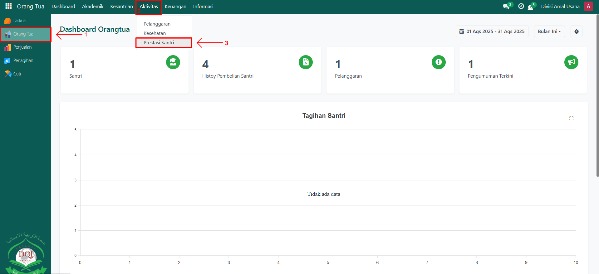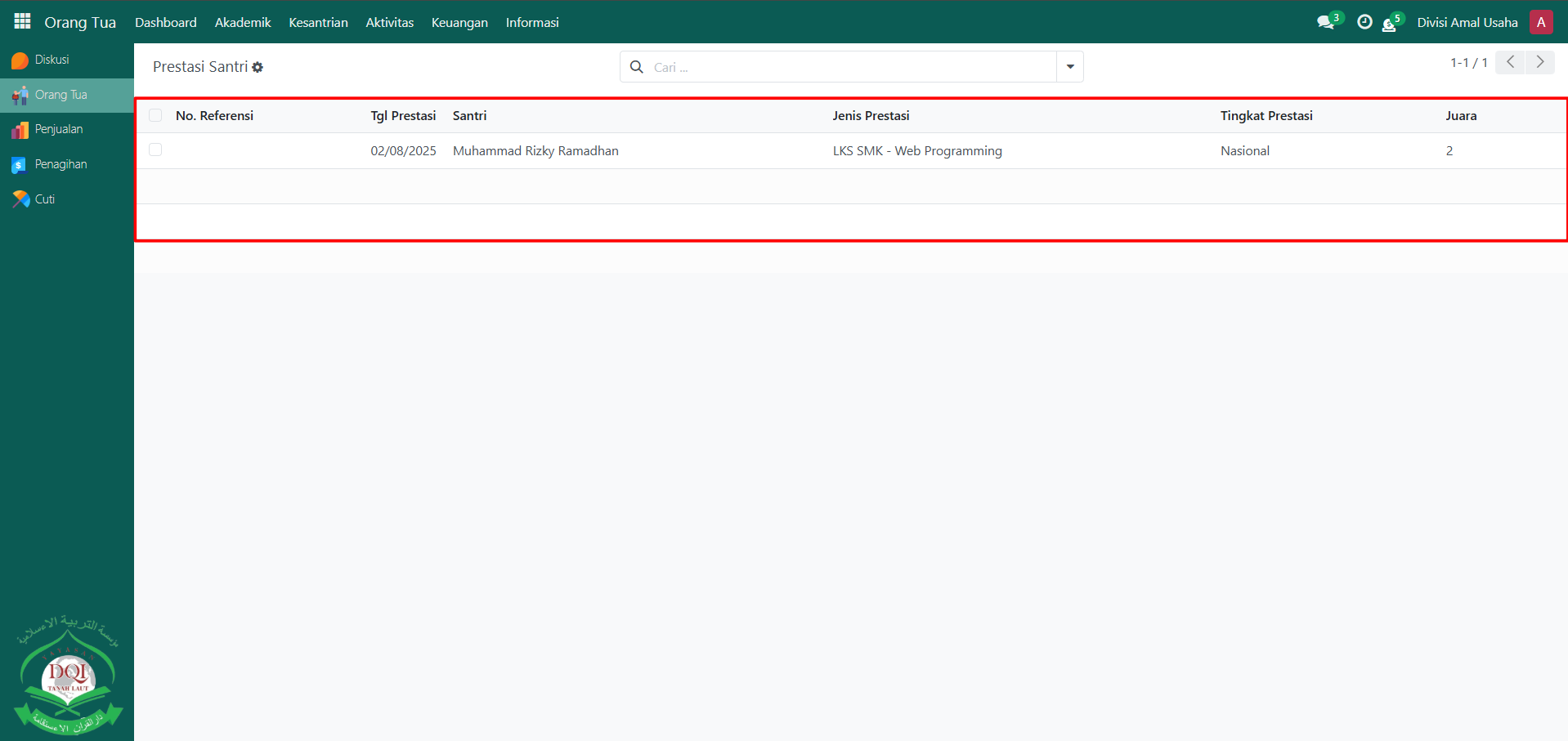 Buka modul Orang Tua, lalu klik menu Aktivitas kemudian pilih submenu Prestasi Santri.