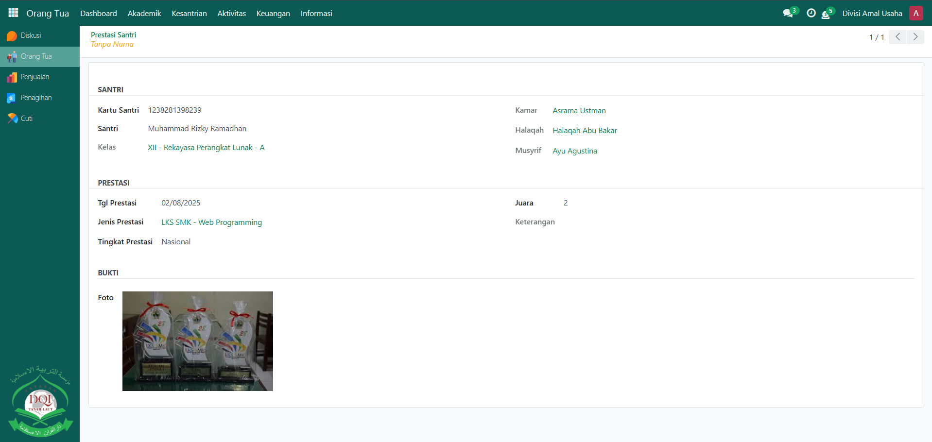 Pada halaman Prestasi Santri, sistem akan menampilkan daftar catatan prestasi anak Anda yang telah dimasukkan oleh musyrif atau guru. Klik salah satu data prestasi untuk melihat detail informasi, seperti nama prestasi, tingkat (lokal/nasional/internasional), juara, tanggal prestasi, deskripsi, serta bukti foto prestasi (jika ada).