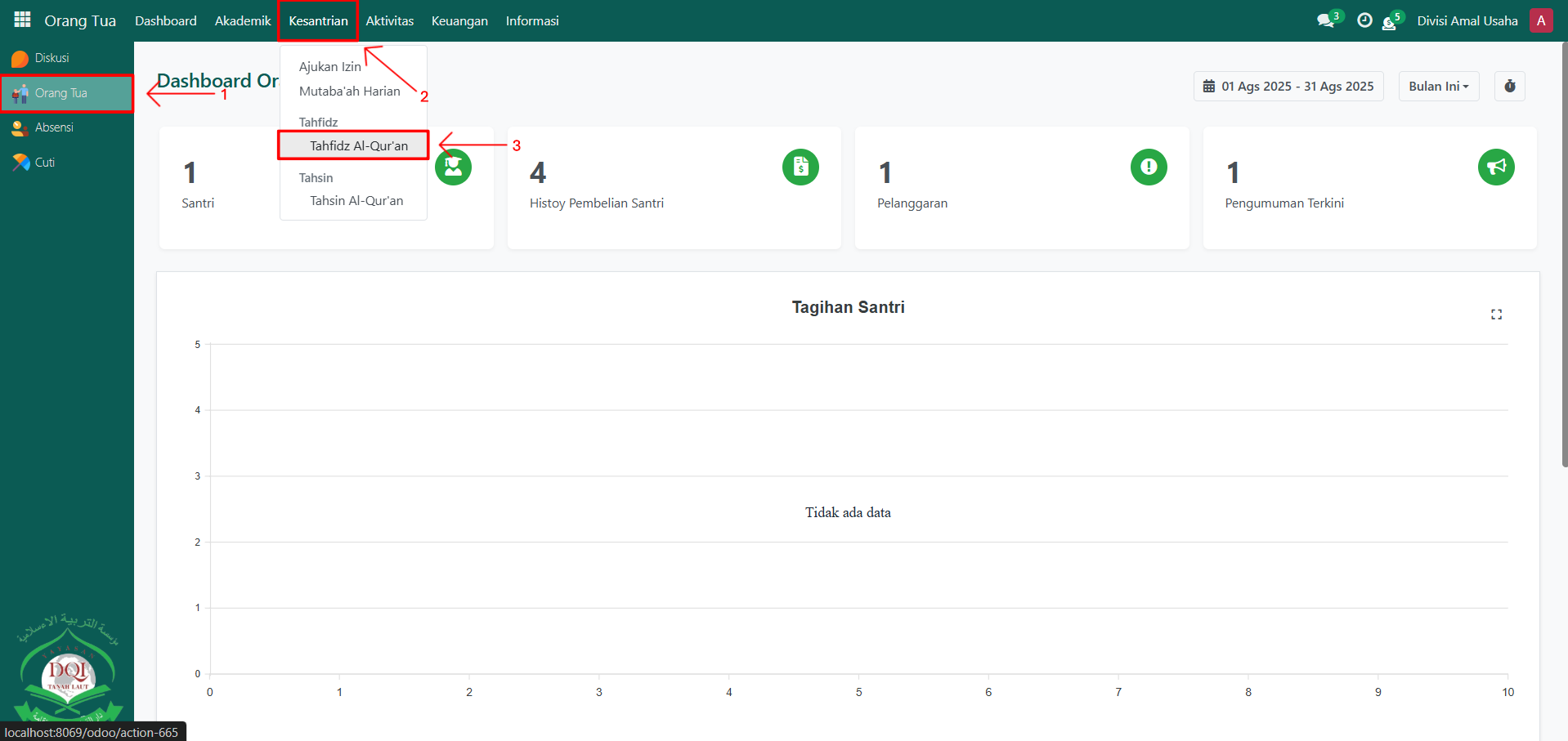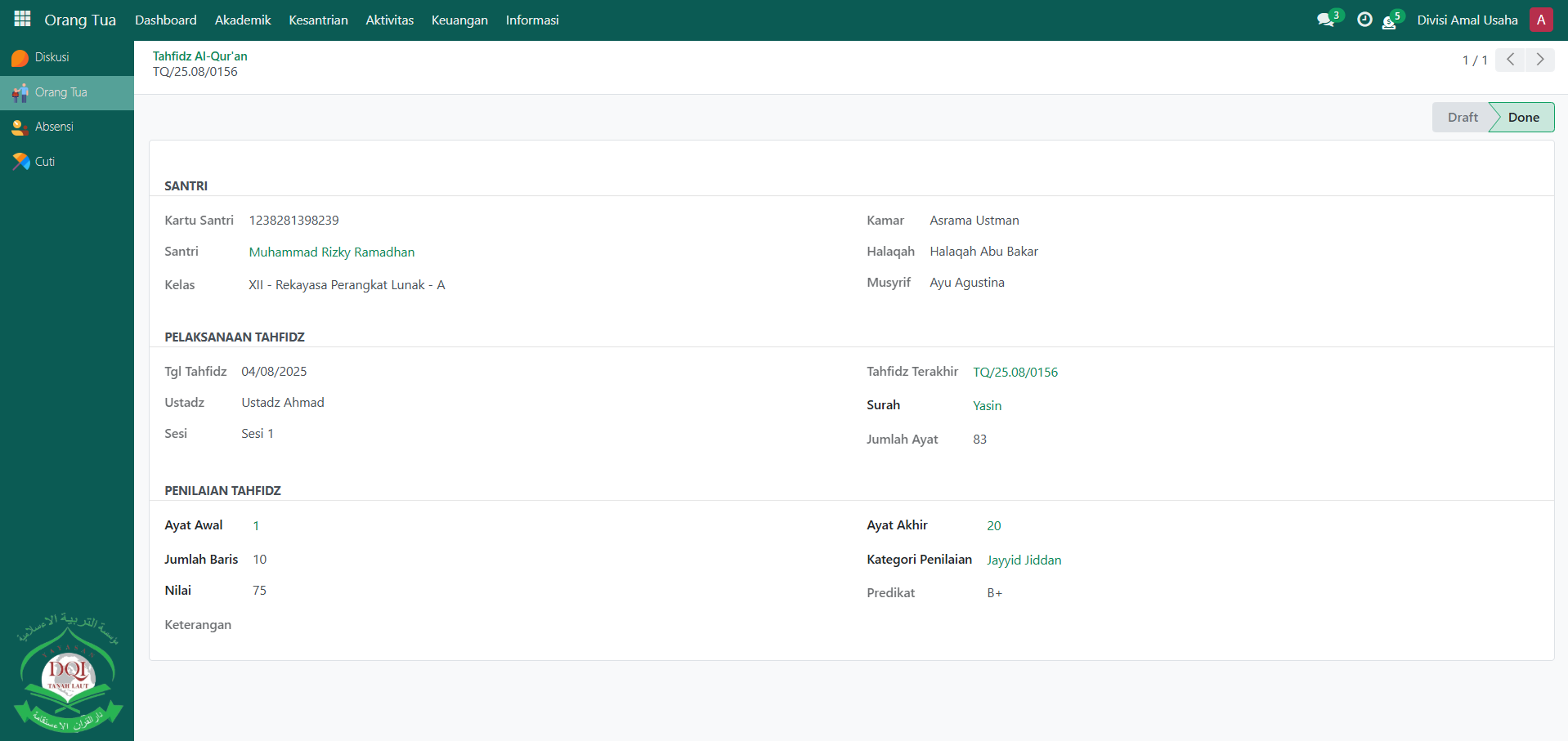 Berikut adalah langkah-langkah untuk memonitoring tahfidz al-qur'an santri pada Odoo Pesantren sebagai orang tua.