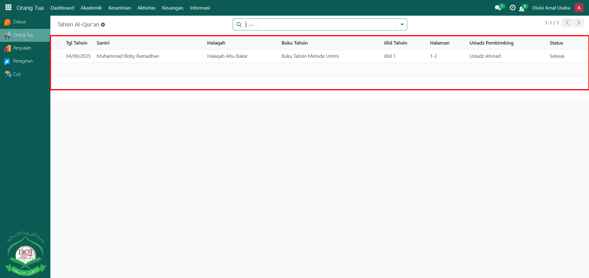 Buka modul Orang Tua, lalu klik menu Kesantrian kemudian pilih submenu Tahsin Al-Qur'an.
