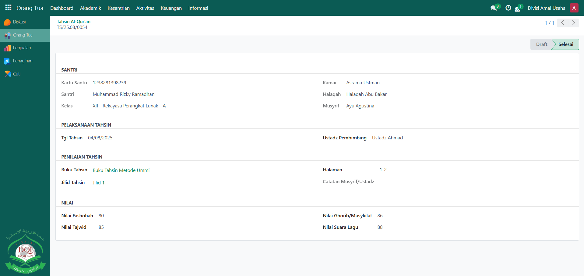 Berikut adalah langkah-langkah untuk memonitoring tahsin al-qur'an santri pada Odoo Pesantren sebagai orang tua.