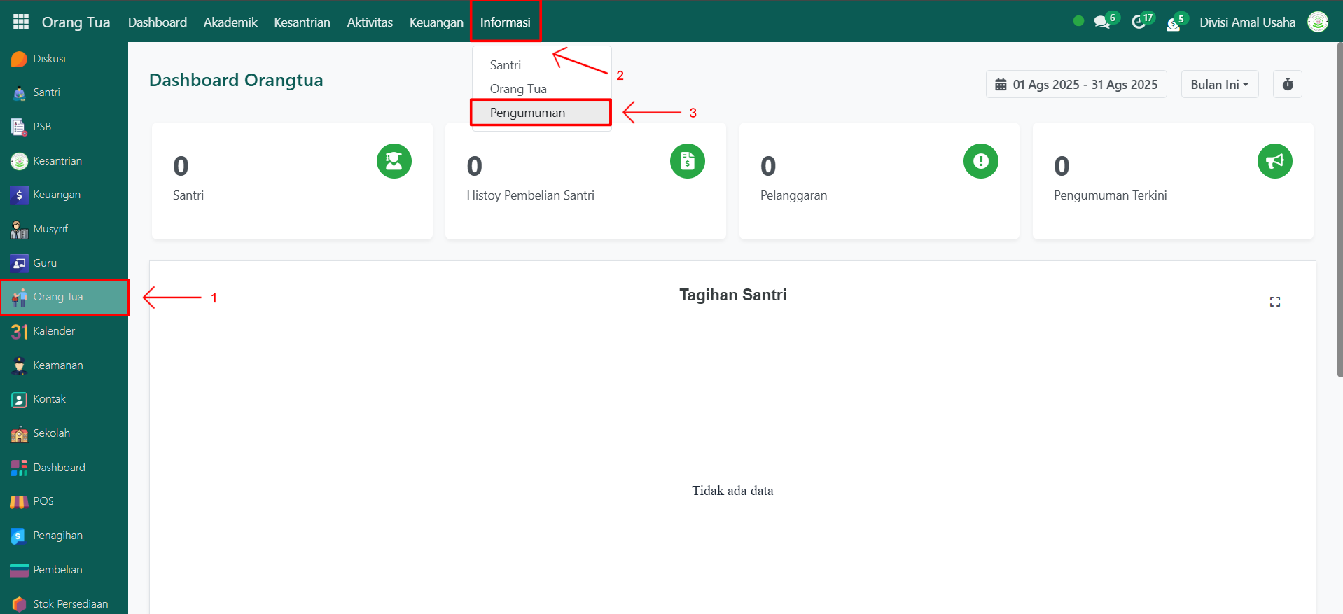 Pengumuman digunakan oleh Administrator untuk menyampaikan informasi penting kepada orang tua atau wali santri melalui sistem. Pengumuman yang ditambahkan akan langsung ditampilkan pada modul Orang Tua, sehingga orang tua dapat membaca informasi terbaru saat login ke sistem. Contoh pengumuman misalnya jadwal ujian, libur pesantren, pembayaran SPP, atau agenda kegiatan pesantren.