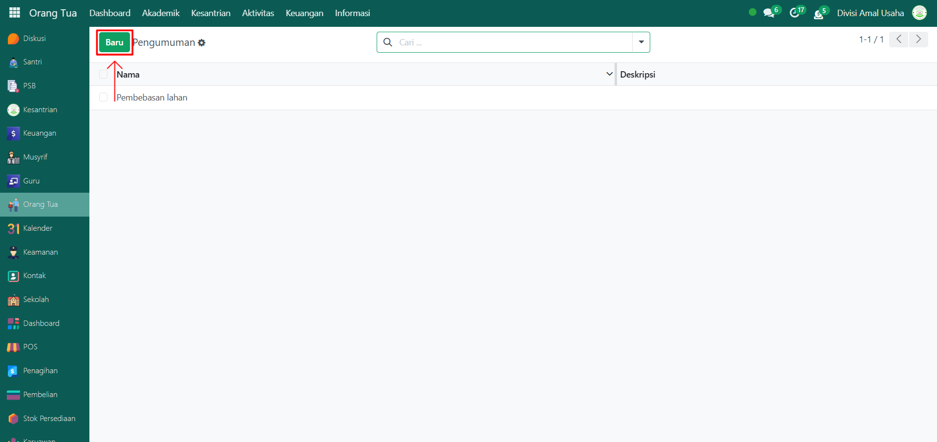 Klik tombol "Baru" untuk membuat pengumuman baru.