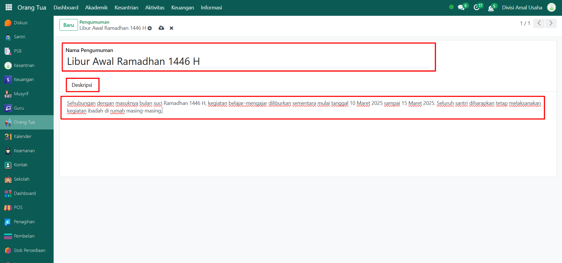 Setelah disimpan, pengumuman akan otomatis ditampilkan dan dapat dilihat oleh orang tua saat login menggunakan akun Orang Tua pada modul yang sama.