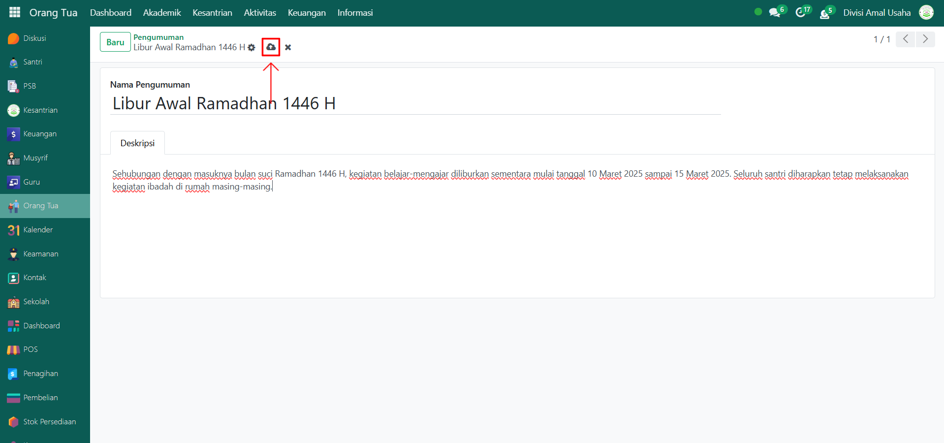 Setelah semua inputan diisi dengan benar, klik ikon Simpan di sebelah kanan ikon Gear agar data pengumuman tersimpan di sistem.