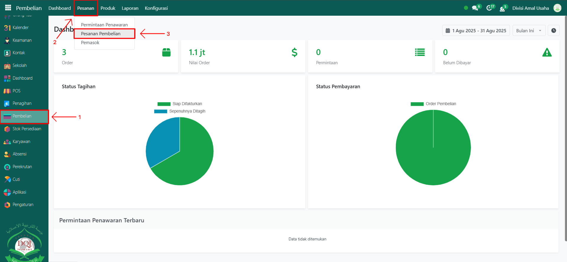 Buka modul Pembelian, lalu klik menu Pesanan kemudian pilih submenu Pesanan Pembelian.