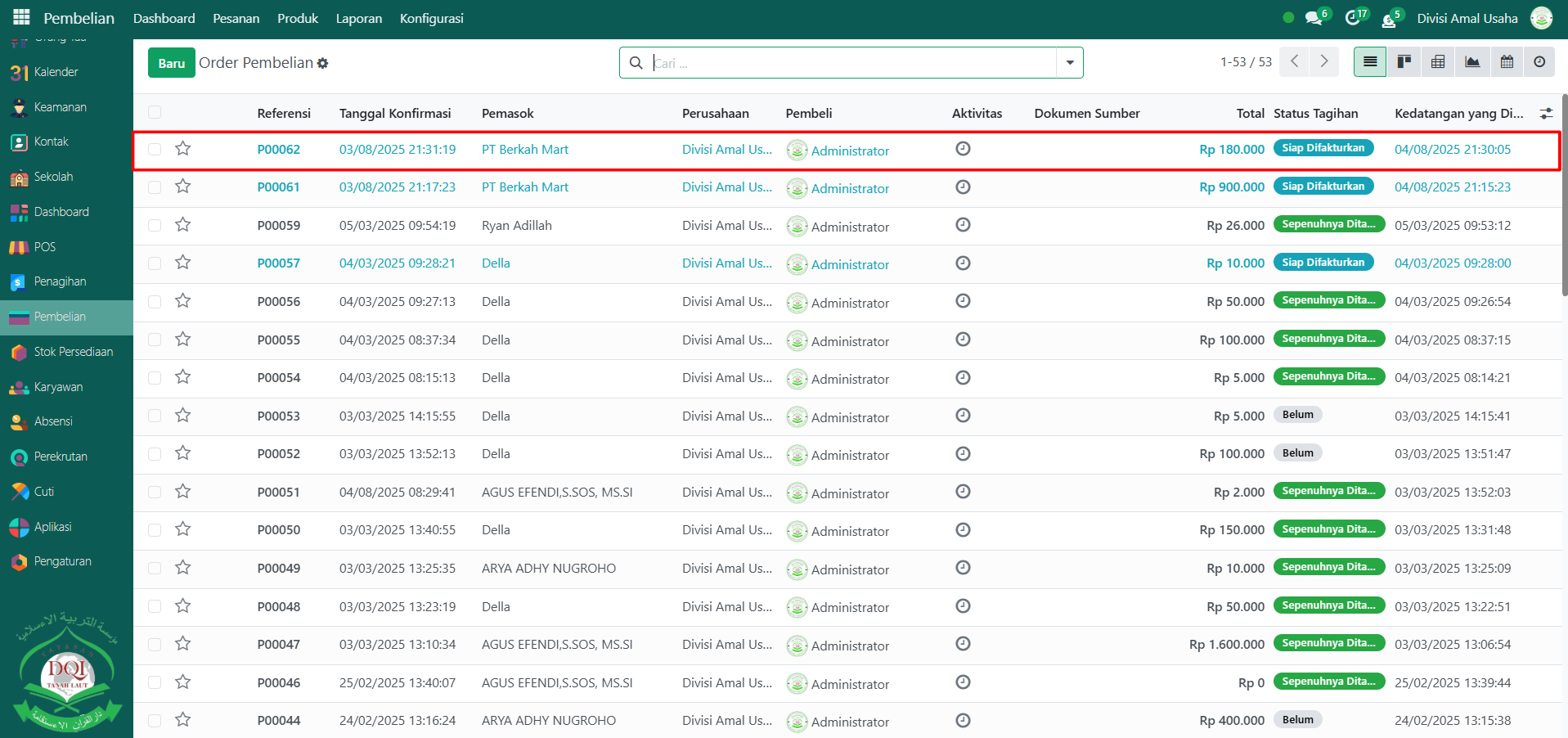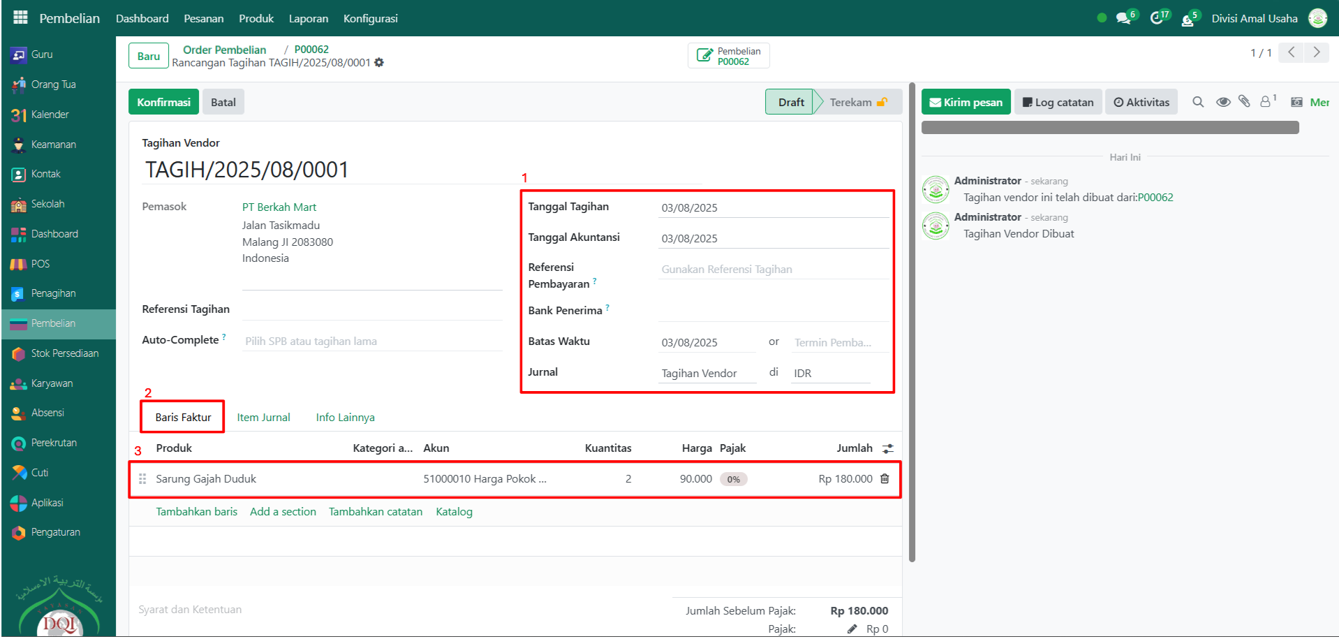 Berikut adalah langkah-langkah untuk melakukan pencatatan tagihan pemasok pada Odoo Pesantren.