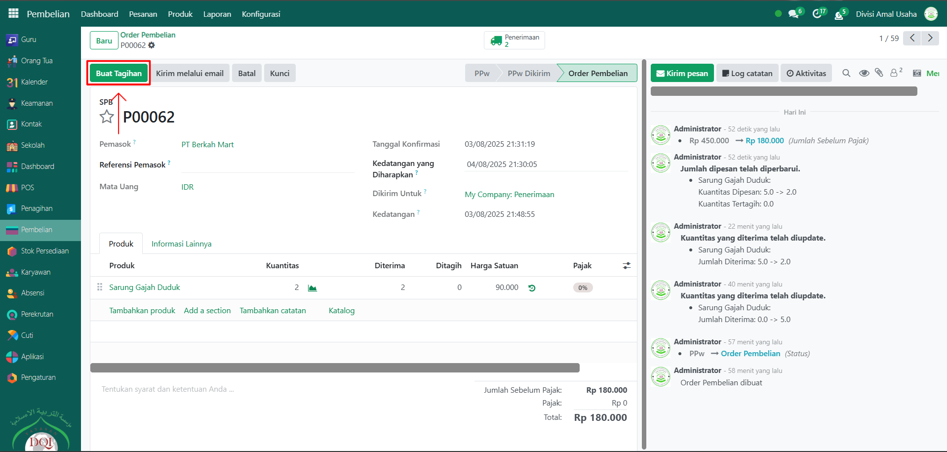 Pada tampilan form order pembelian, klik tombol "Buat Tagihan" untuk membuat catatan tagihan dari pemasok.