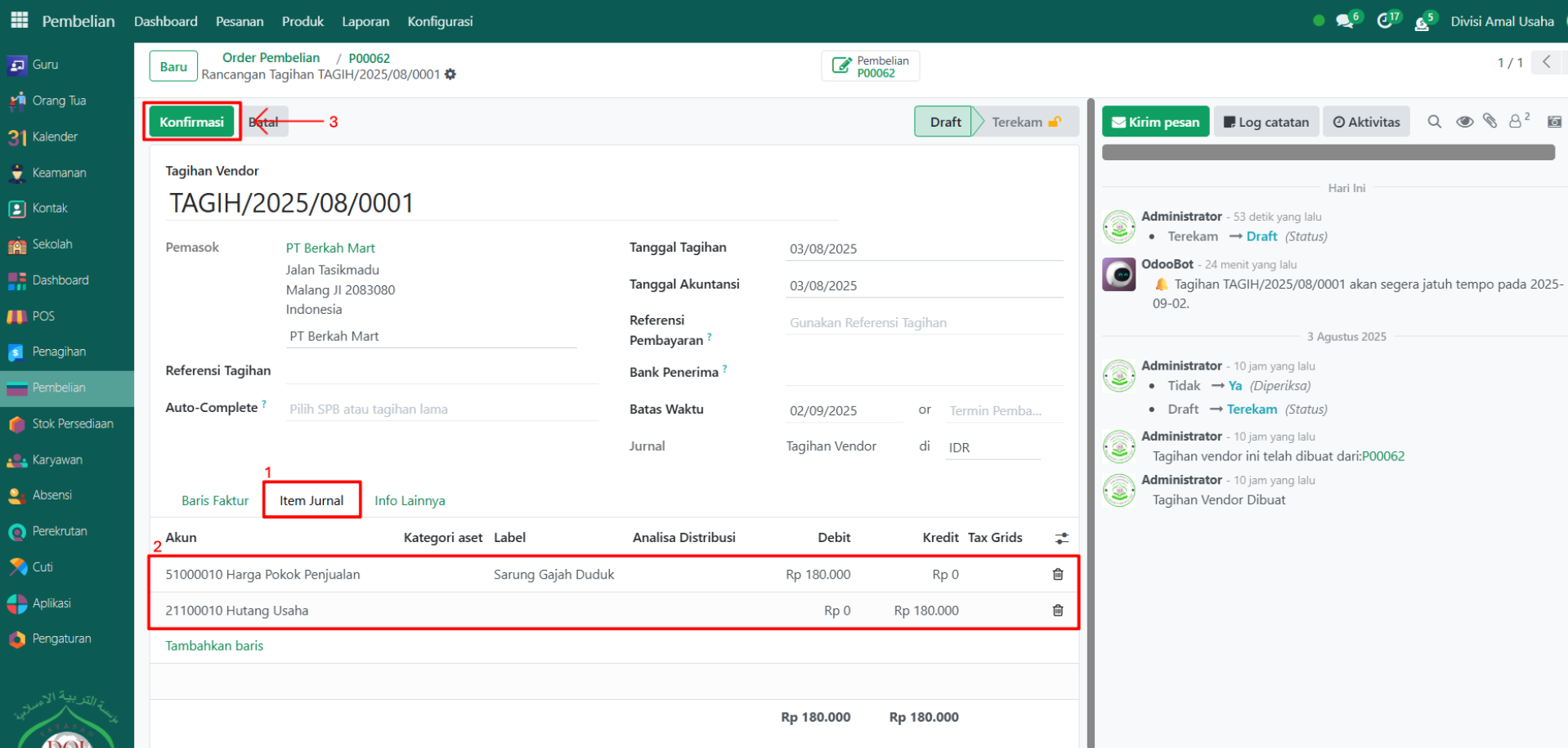 Pindah ke Tab Item Jurnal, periksa apakah akun yang tercatat sudah sesuai dengan konfigurasi akuntansi. Jika semua data sudah benar, klik tombol "Konfirmasi". Status tagihan pemasok akan berubah dari Draft menjadi Terekam.