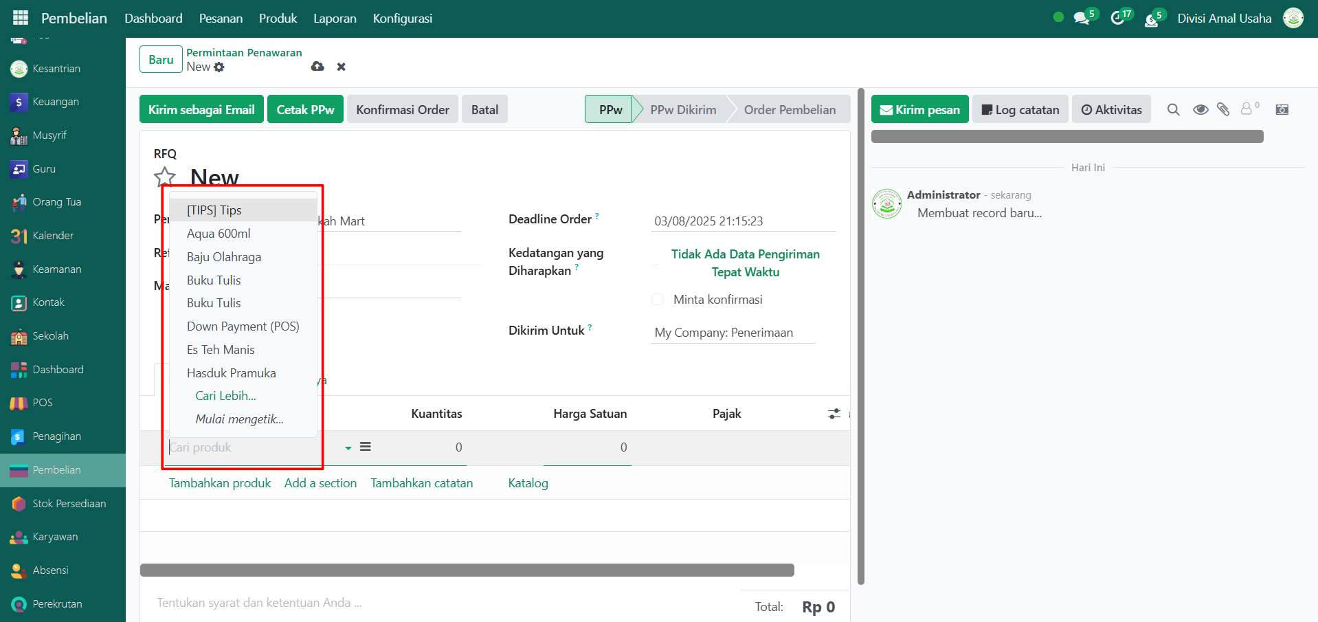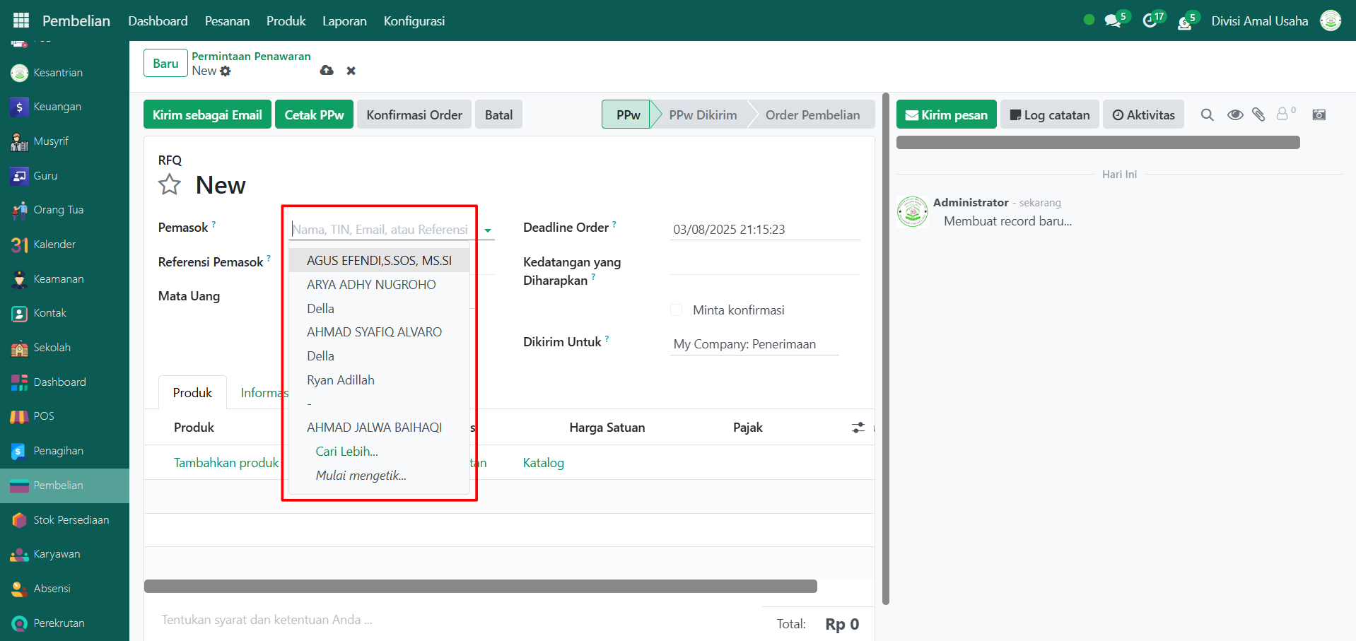 Berikut adalah langkah-langkah untuk melakukan order pembelian barang kepada pemasok pada Odoo Pesantren.