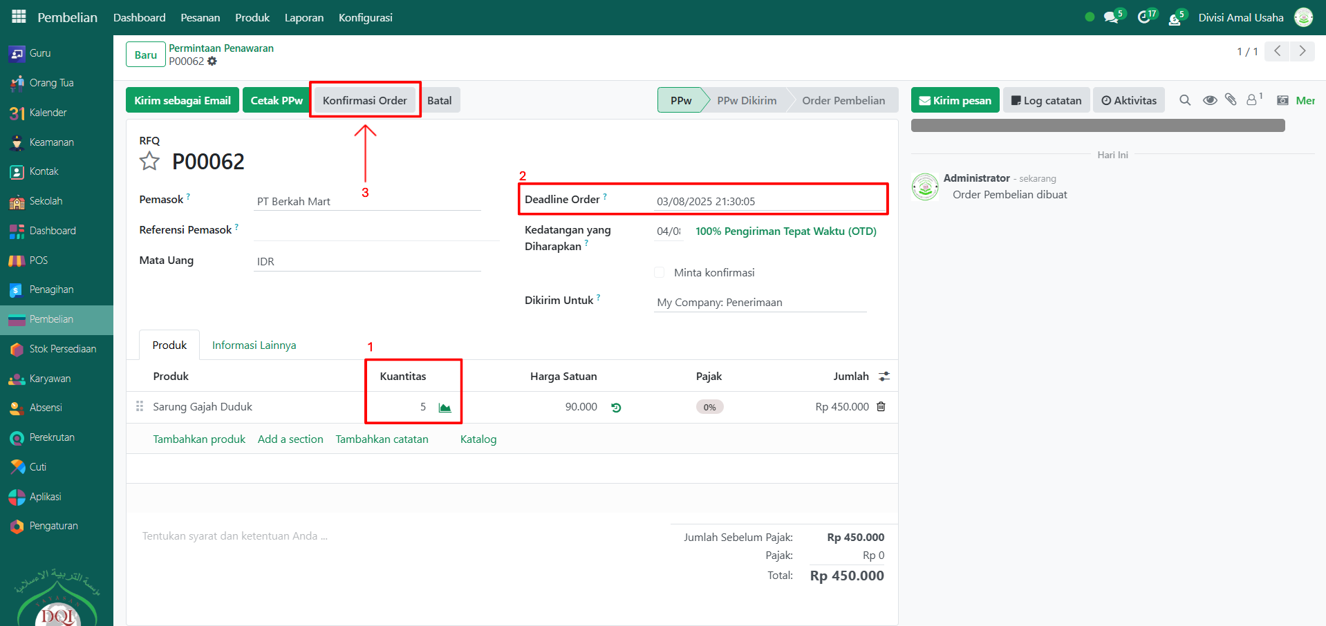 Kemudian isi Kuantitas, Harga Satuan (akan otomatis terisi jika produk sudah memiliki harga), dan Deadline Order (tanggal jatuh tempo). Setelah data terisi lengkap, klik tombol "Konfirmasi Order" untuk memproses pesanan pembelian. Status order akan berubah dari Draft menjadi Purchase Order.