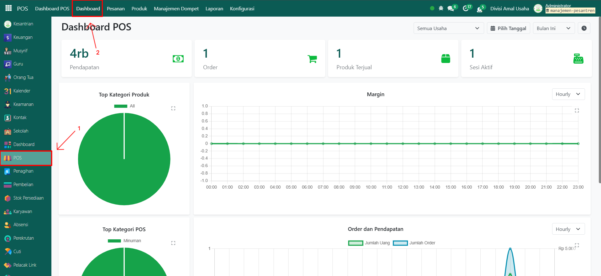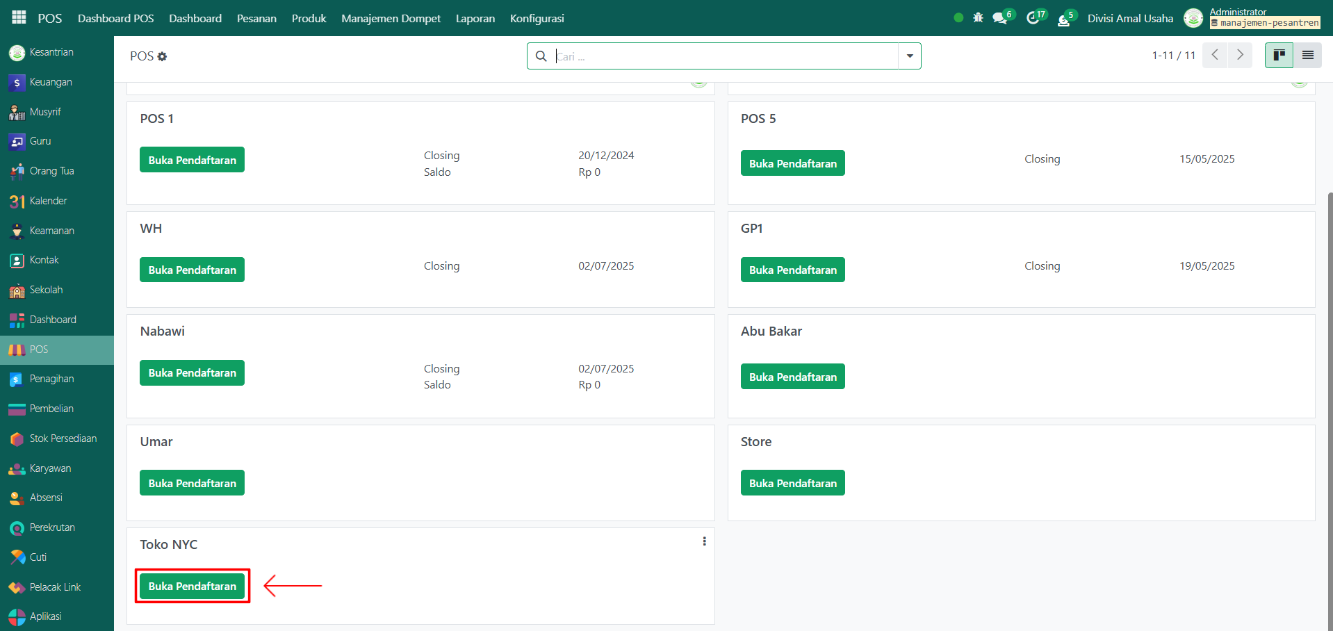 Pada tampilan dashboard, pilih salah satu sesi POS (misalnya kantin atau toko pesantren) yang ingin dibuka, kemudian klik tombol "Buka Pendaftaran".