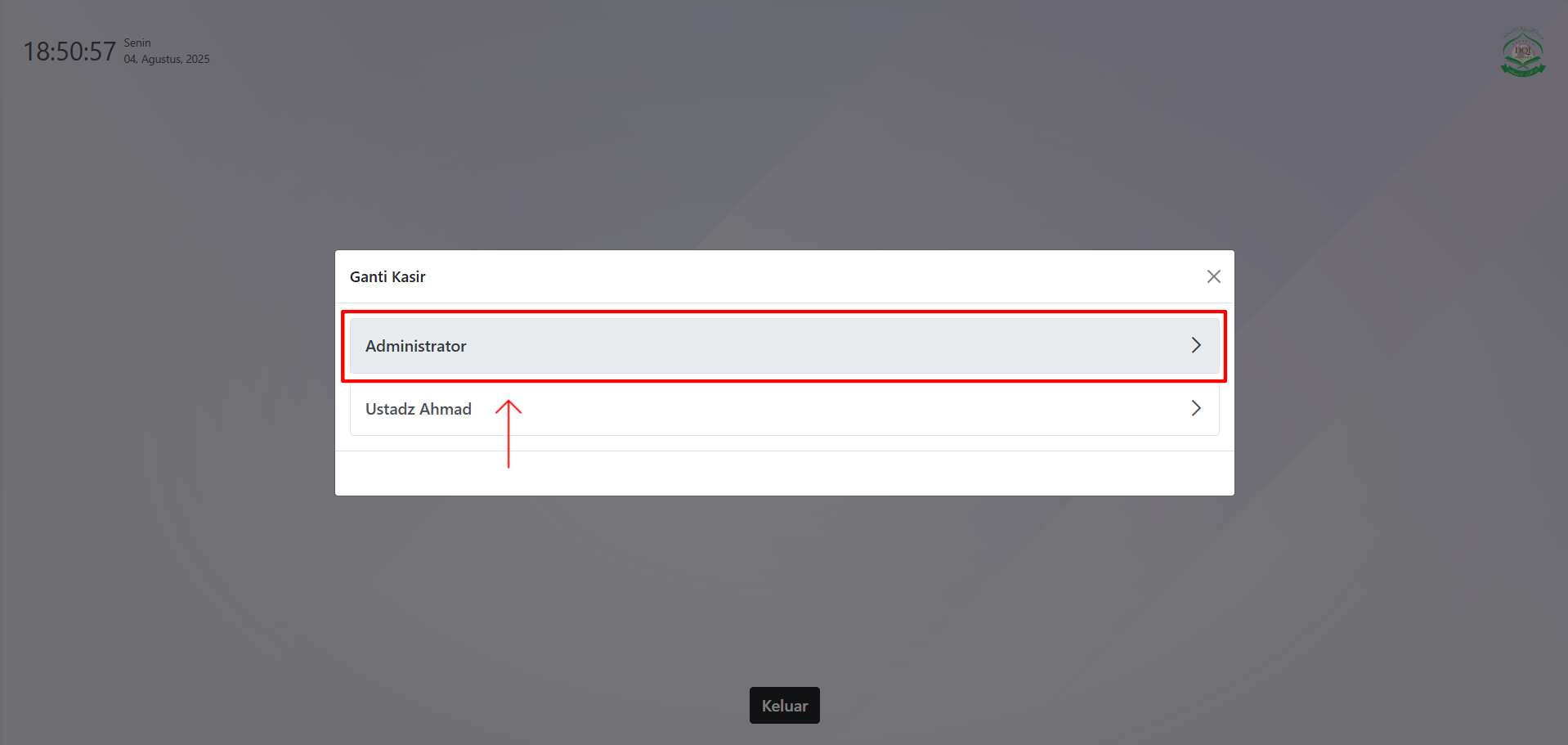 Muncul pop up pemilihan pengguna, pilih karyawan yang akan bertugas di sesi POS tersebut (misalnya: Administrator).