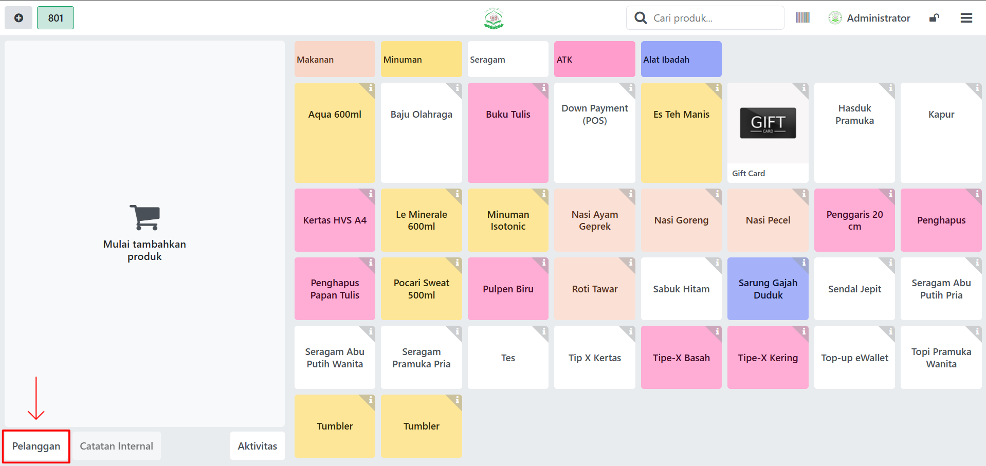 Untuk memulai transaksi, pilih pelanggan dengan klik tombol "Pelanggan" di pojok kiri bawah.