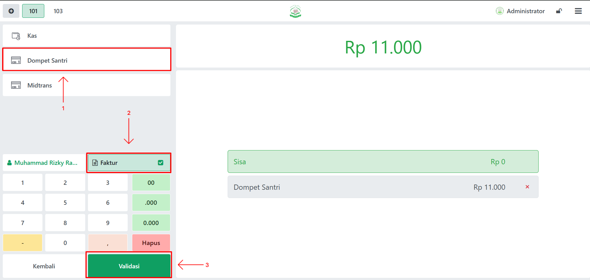Pada tampilan pembayaran POS, pilih metode pembayaran (misalnya: Dompet Santri). Jika ingin transaksi penjualan langsung tercatat sebagai faktur, aktifkan opsi Faktur. Klik tombol "Validasi" untuk melanjutkan proses pembayaran.