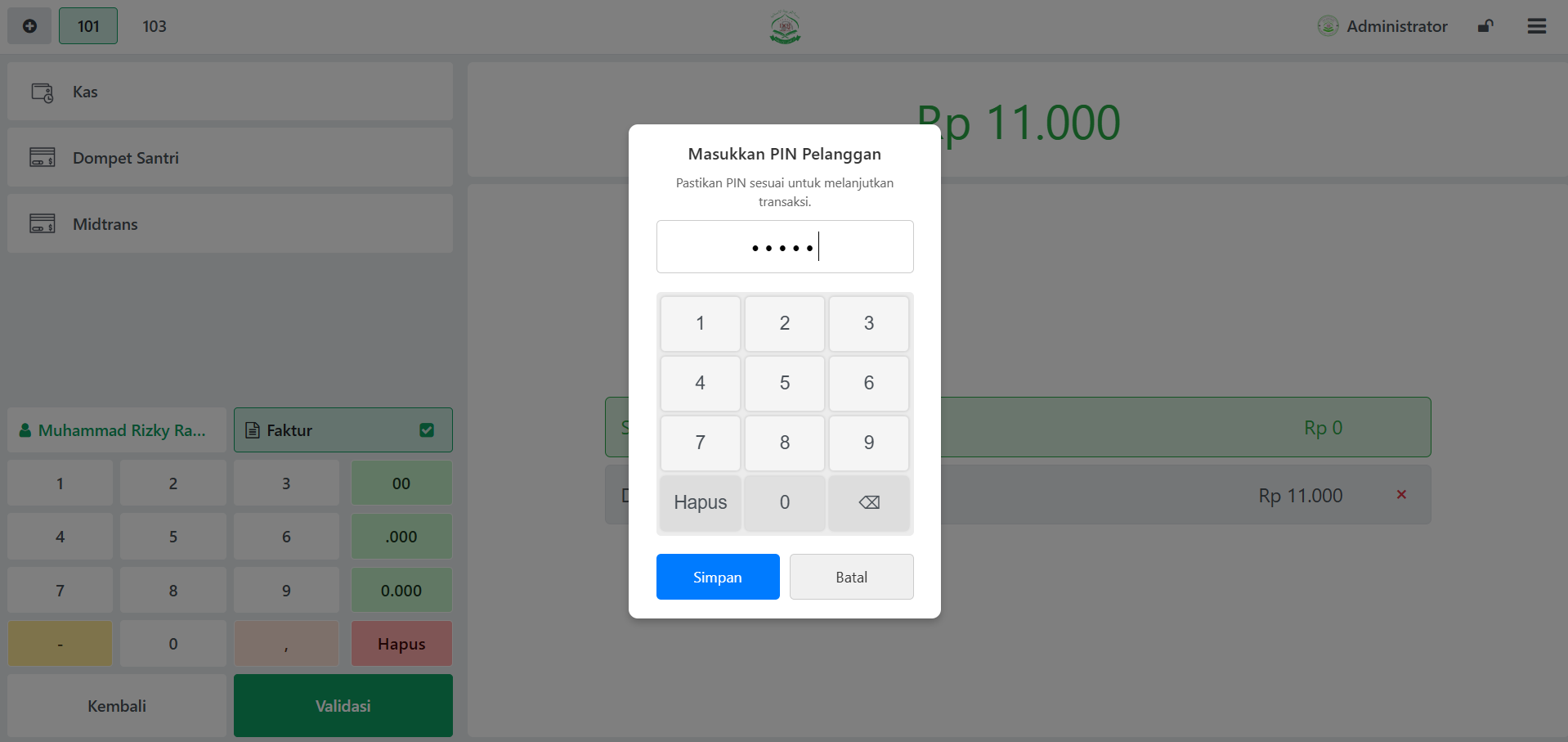 Sistem akan menampilkan pop up konfirmasi PIN. Lalu masukkan PIN Dompet Santri milik pelanggan.