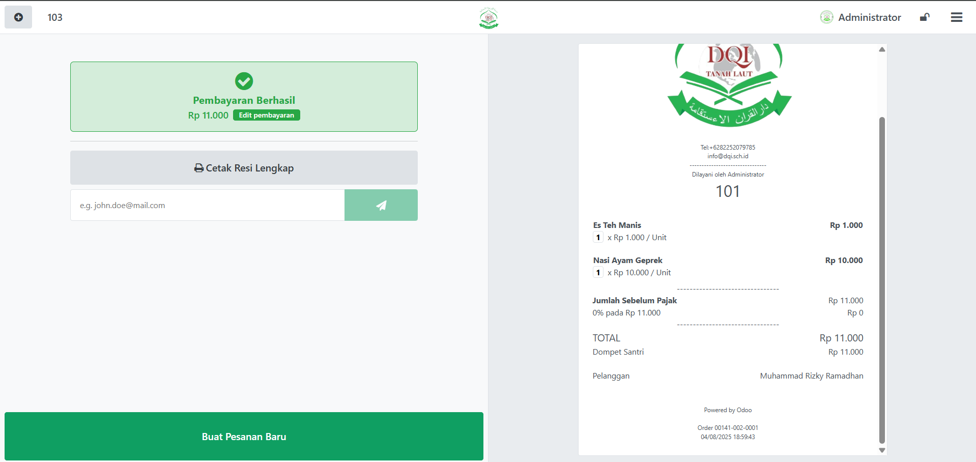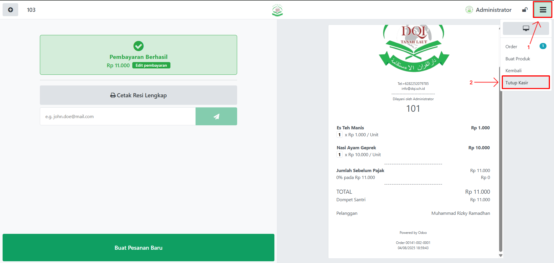Sesi POS akan ditutup, dan transaksi penjualan tercatat otomatis di sistem.