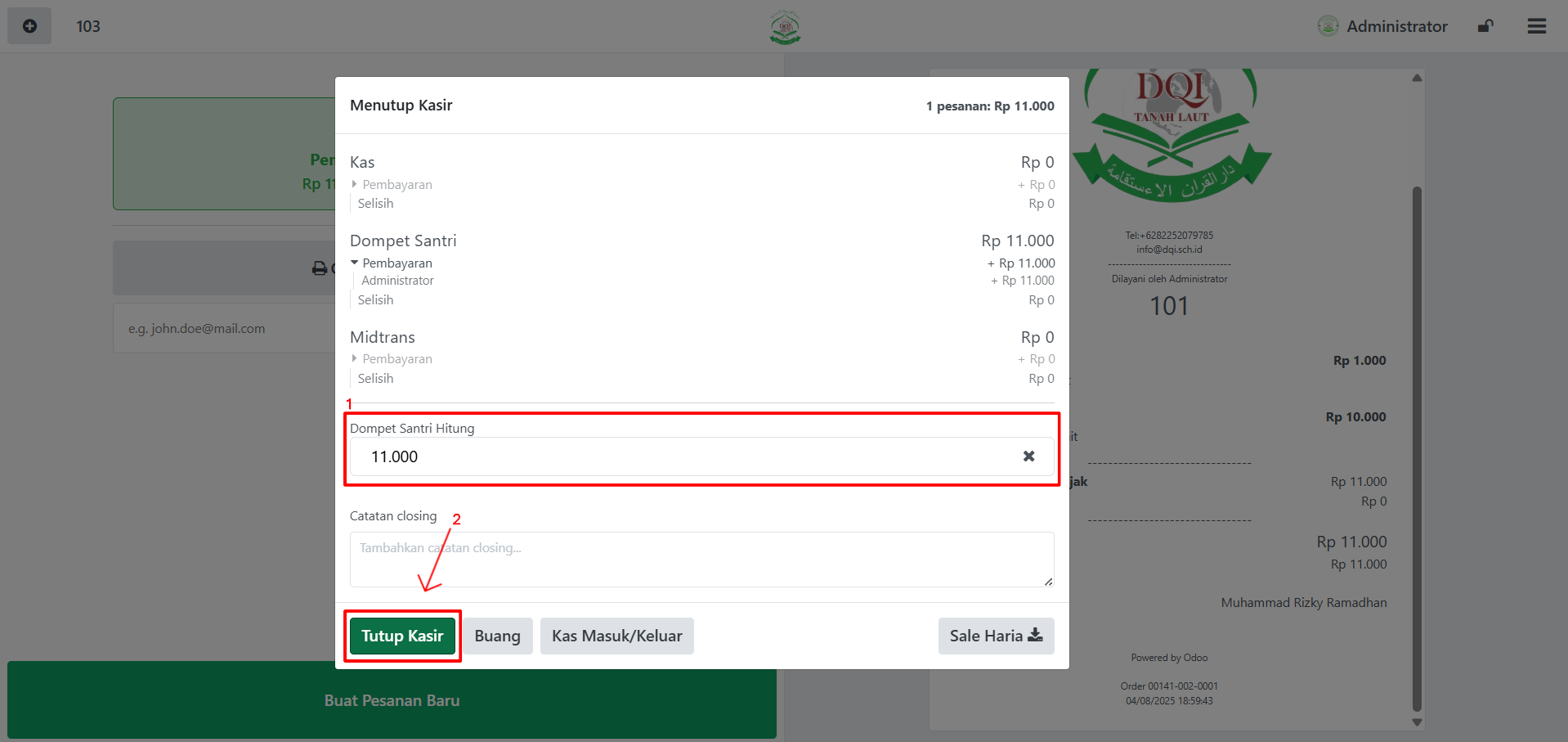 Akan muncul pop up Tutup Kasir. Periksa kolom Dompet Santri Hitung (biasanya otomatis terisi sesuai transaksi). Jika sudah sesuai, klik tombol "Tutup Kasir" untuk menyelesaikan sesi POS.