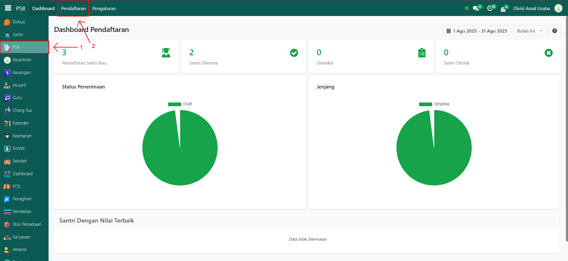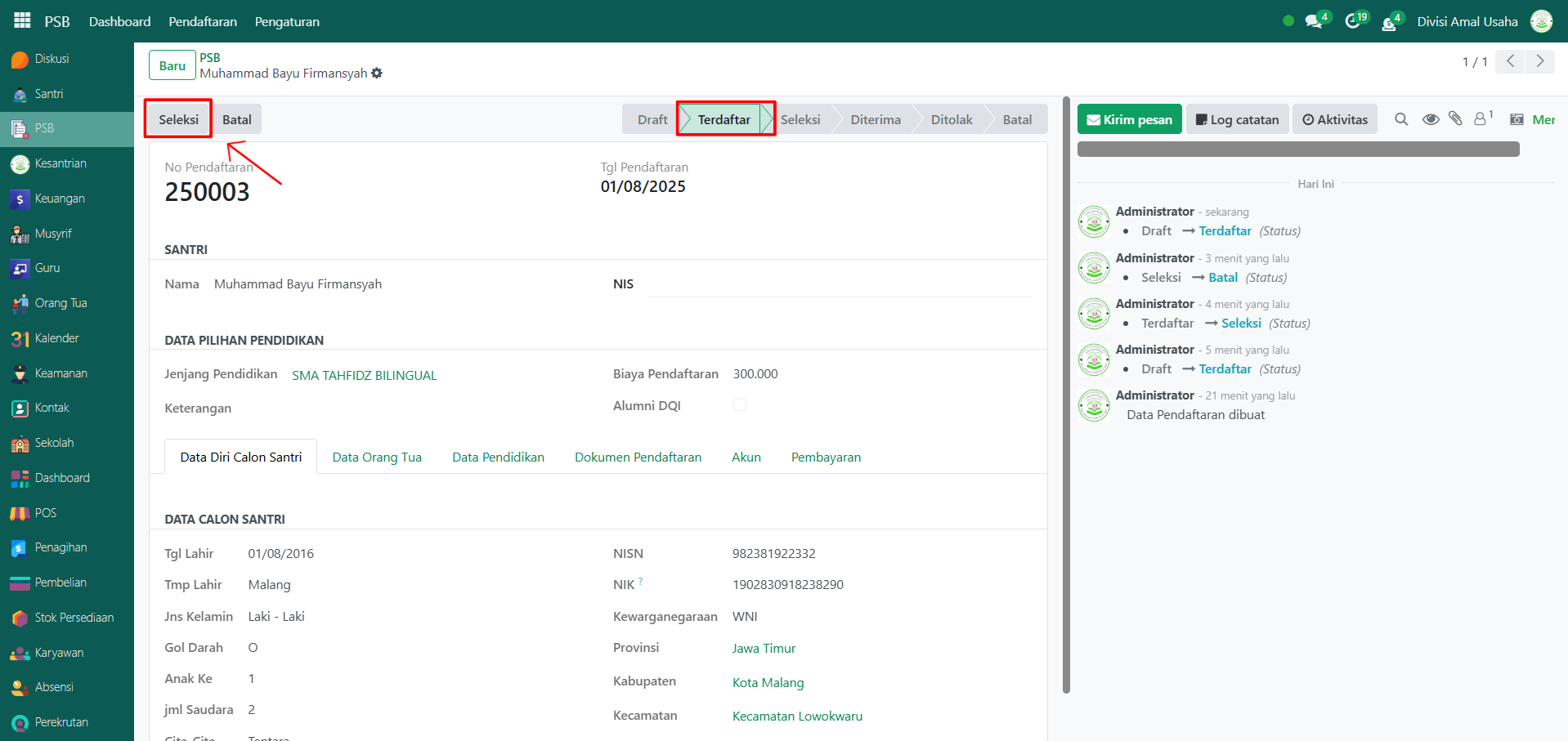 Buka modul PSB, lalu klik menu Pendaftaran untuk mulai mengelola daftar pendaftaran yang telah diajukan oleh calon santri.