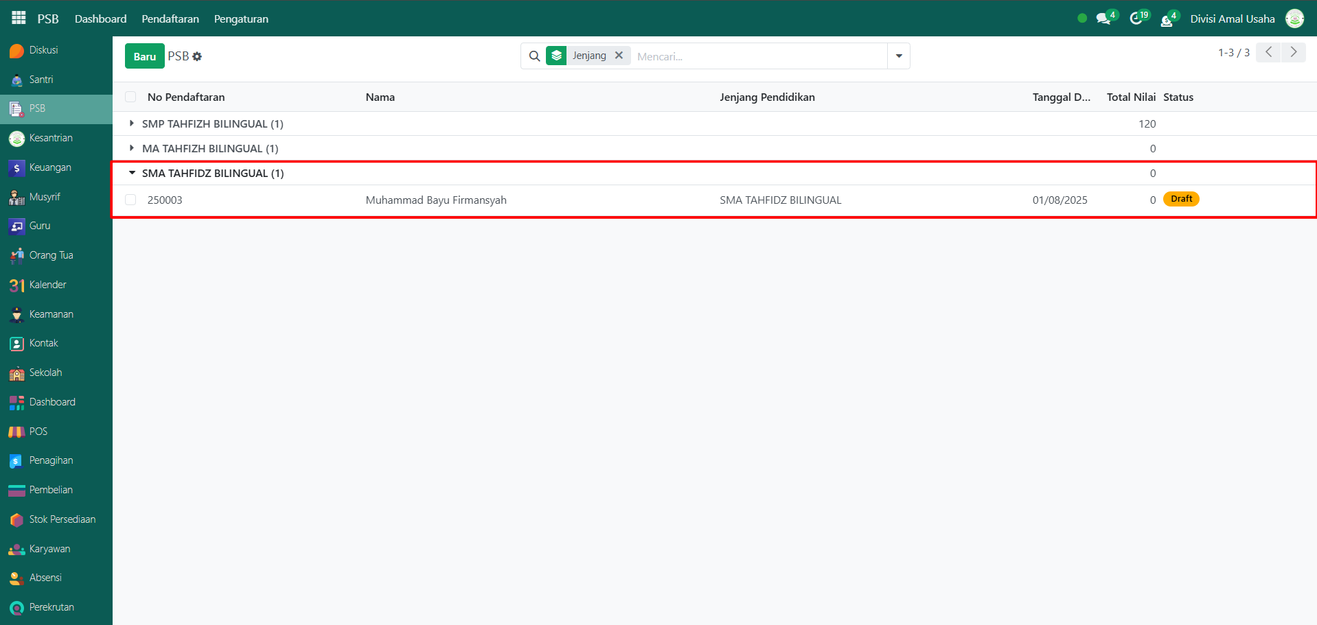 Klik salah satu pendaftar untuk melihat informasi detail. Misalnya, pada jenjang SMA Tahfidz Bilingual terdapat pendaftar baru dengan status Draft.