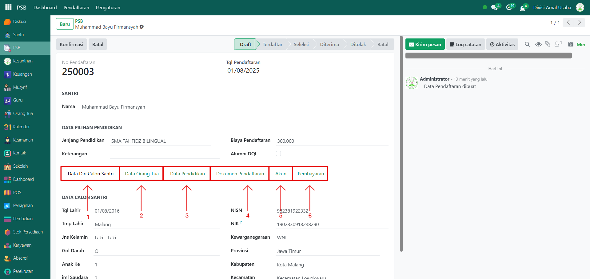 | Draft | Pendaftaran masih berupa draft; calon santri belum melakukan pembayaran biaya pendaftaran. |
