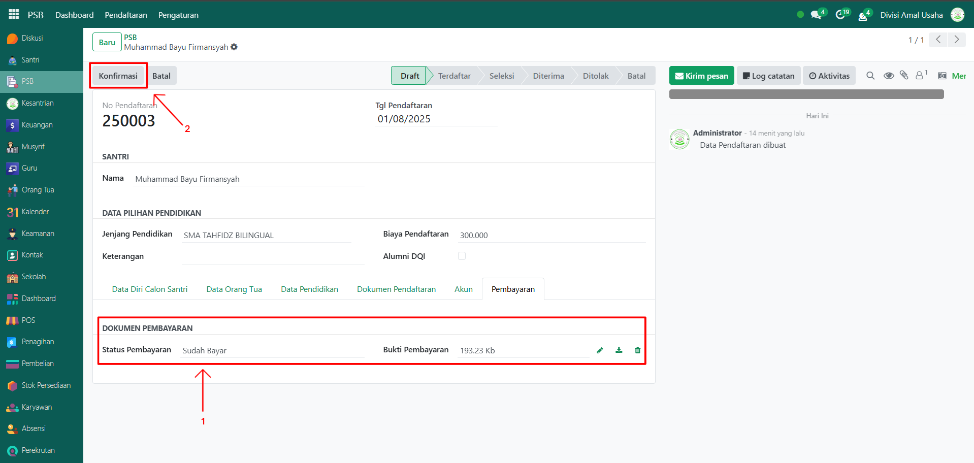 Klik tombol "Konfirmasi" jika calon santri sudah melakukan pembayaran. Namun, jika ingin membatalkan calon santri -> klik tombol "Batal".