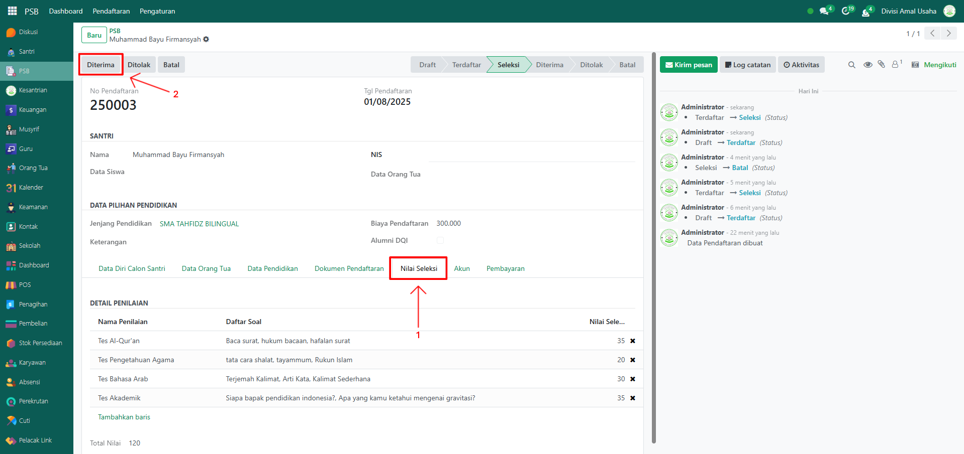 Akan muncul tab baru bernama Nilai Seleksi. Masuk ke tab ini, lalu tambahkan penilaian sesuai kriteria, misalnya: Tes Al-Qur’an, Tes Pengetahuan Agama, Tes Bahasa Arab, dan Tes Akademik. Jika santri memenuhi kriteria, klik tombol "Diterima". Namun, jika santri tidak memenuhi kriteria, klik tombol "Ditolak".