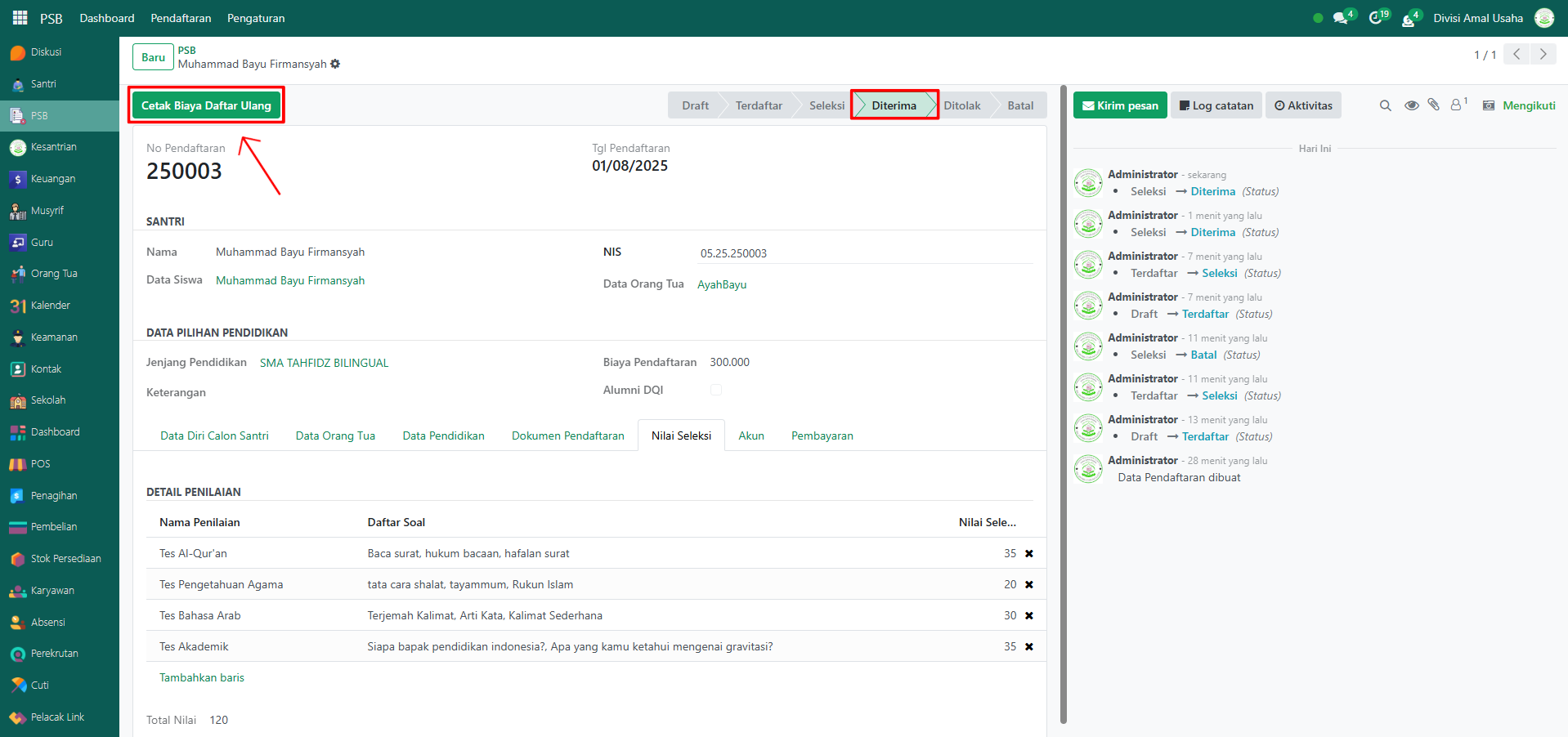 Setelah calon santri dinyatakan Diterima, sistem akan menampilkan tombol "Cetak Biaya Daftar Ulang". Tombol ini digunakan untuk mencetak rincian biaya daftar ulang santri.