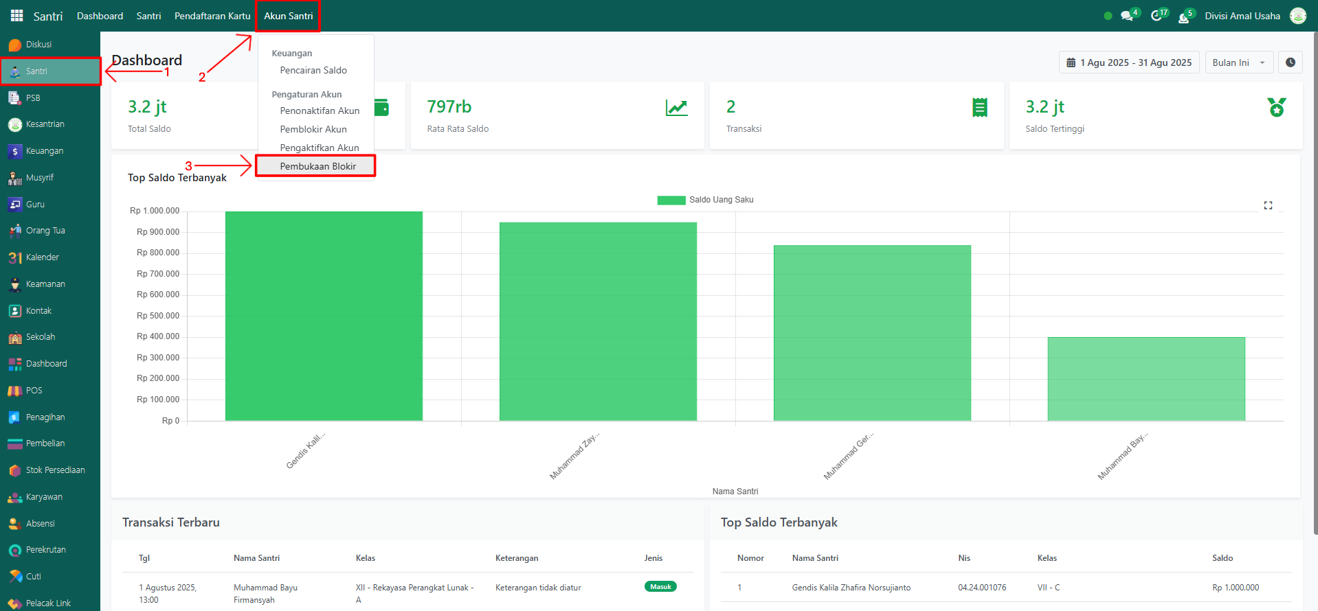 Pembukaan Akun digunakan ketika akun santri yang sebelumnya diblokir karena pelanggaran atau alasan tertentu ingin dipulihkan kembali. Dengan fitur ini, akun santri dapat kembali digunakan untuk berbagai transaksi seperti pengisian saldo, pencairan, pembayaran, maupun aktivitas yang ada di pesantren.