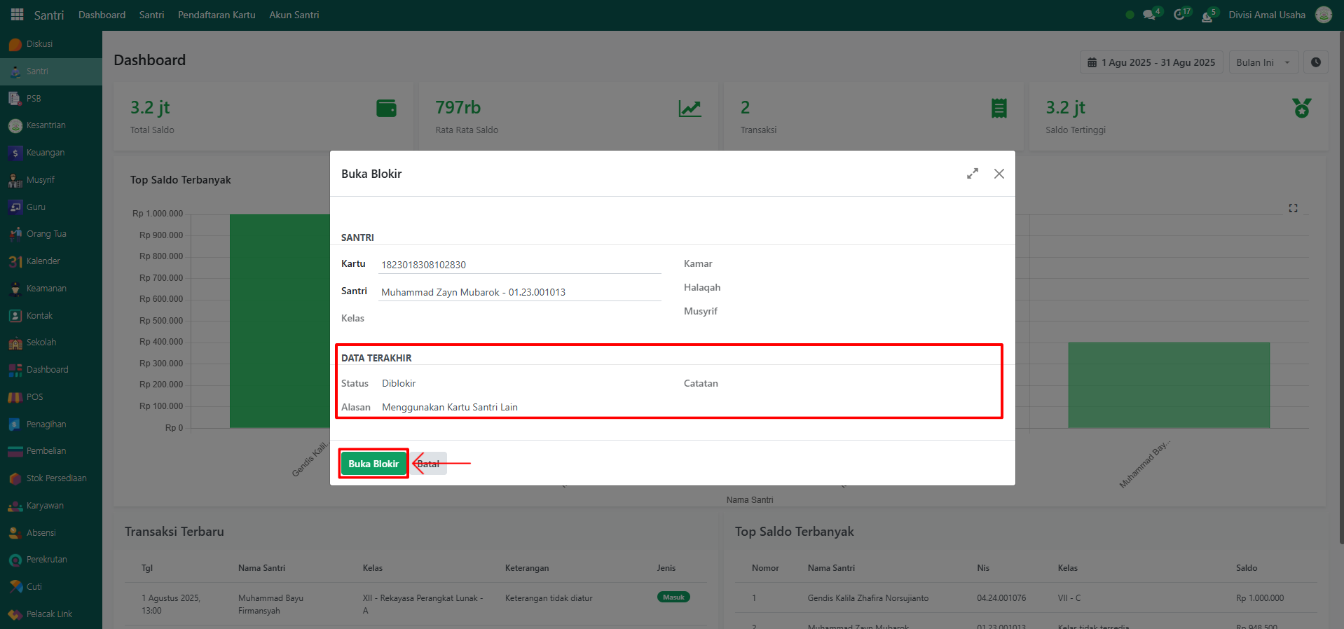 Sistem akan menampilkan informasi status kartu beserta alasan pemblokiran sebelumnya. Lalu klik tombol "Buka Blokir" untuk memproses pembukaan akun santri.