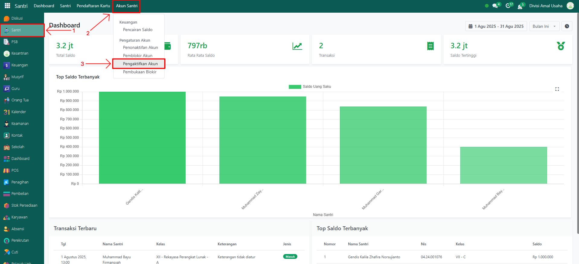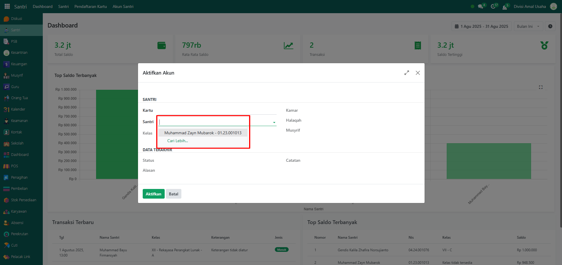 Pengaktifan Akun digunakan ketika akun santri yang sebelumnya dinonaktifkan ingin dipulihkan agar bisa kembali digunakan untuk transaksi keuangan, seperti pengisian saldo, pencairan, maupun pembayaran.