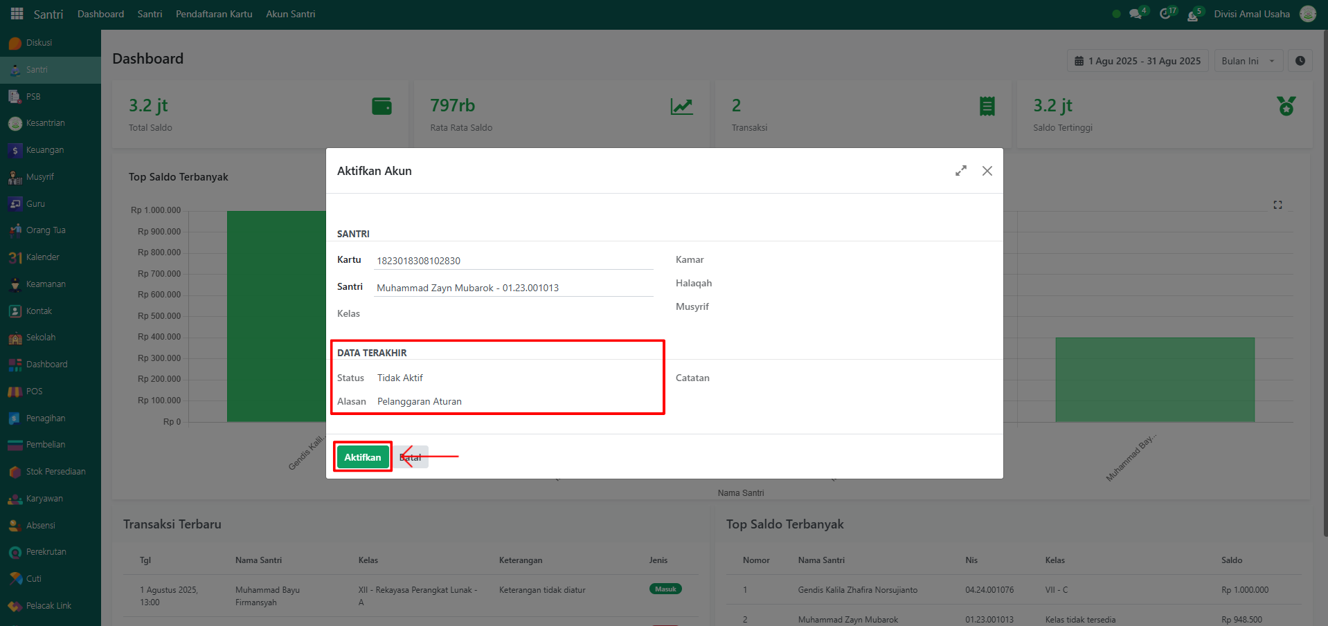 Sistem akan menampilkan informasi status kartu beserta alasan penonaktifan sebelumnya. Lalu klik tombol "Aktifkan" untuk memproses pengaktifan kembali akun santri.