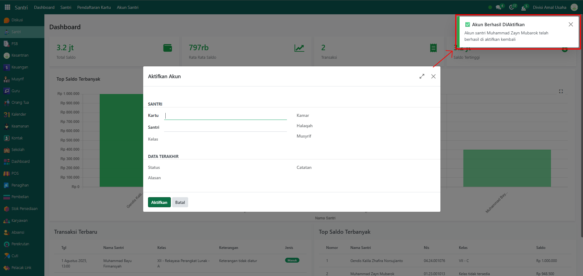 Setelah berhasil, sistem akan menampilkan notifikasi bahwa akun santri berhasil diaktifkan dan dapat kembali digunakan untuk transaksi.