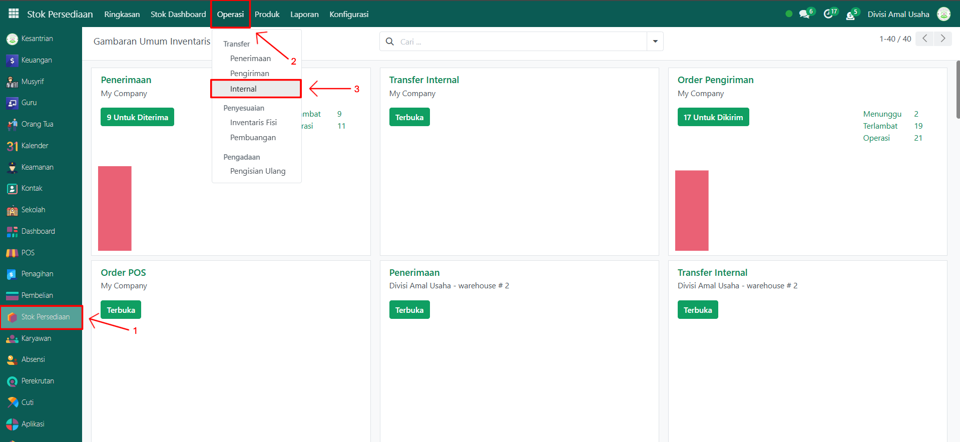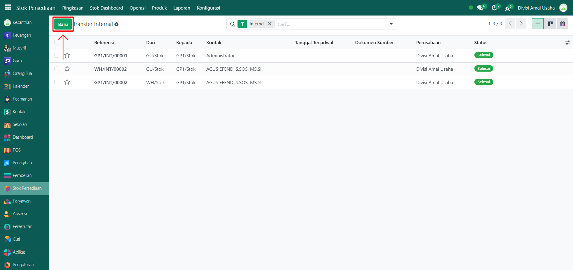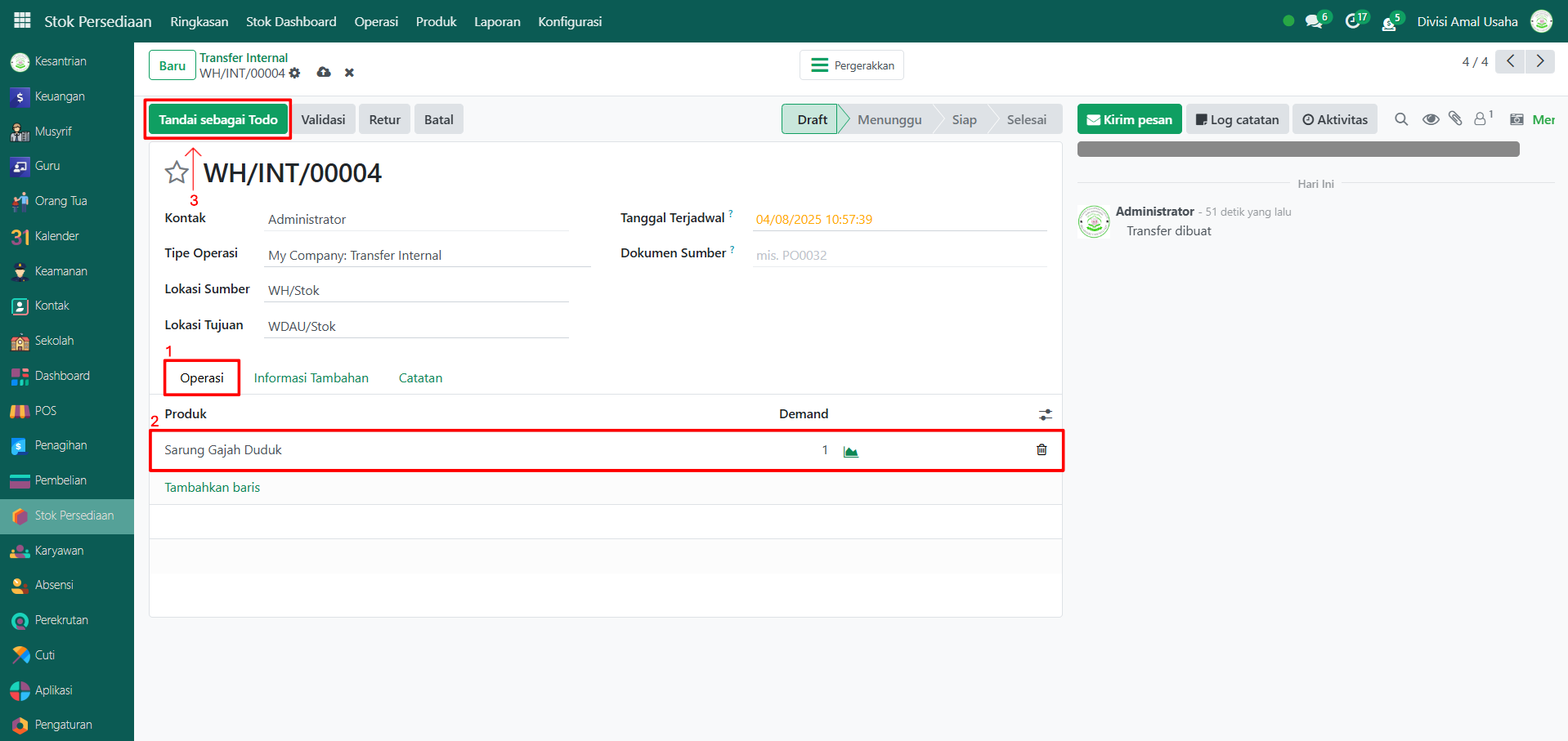 Berikut adalah langkah-langkah untuk melakukan operasi internal pada Odoo Pesantren.