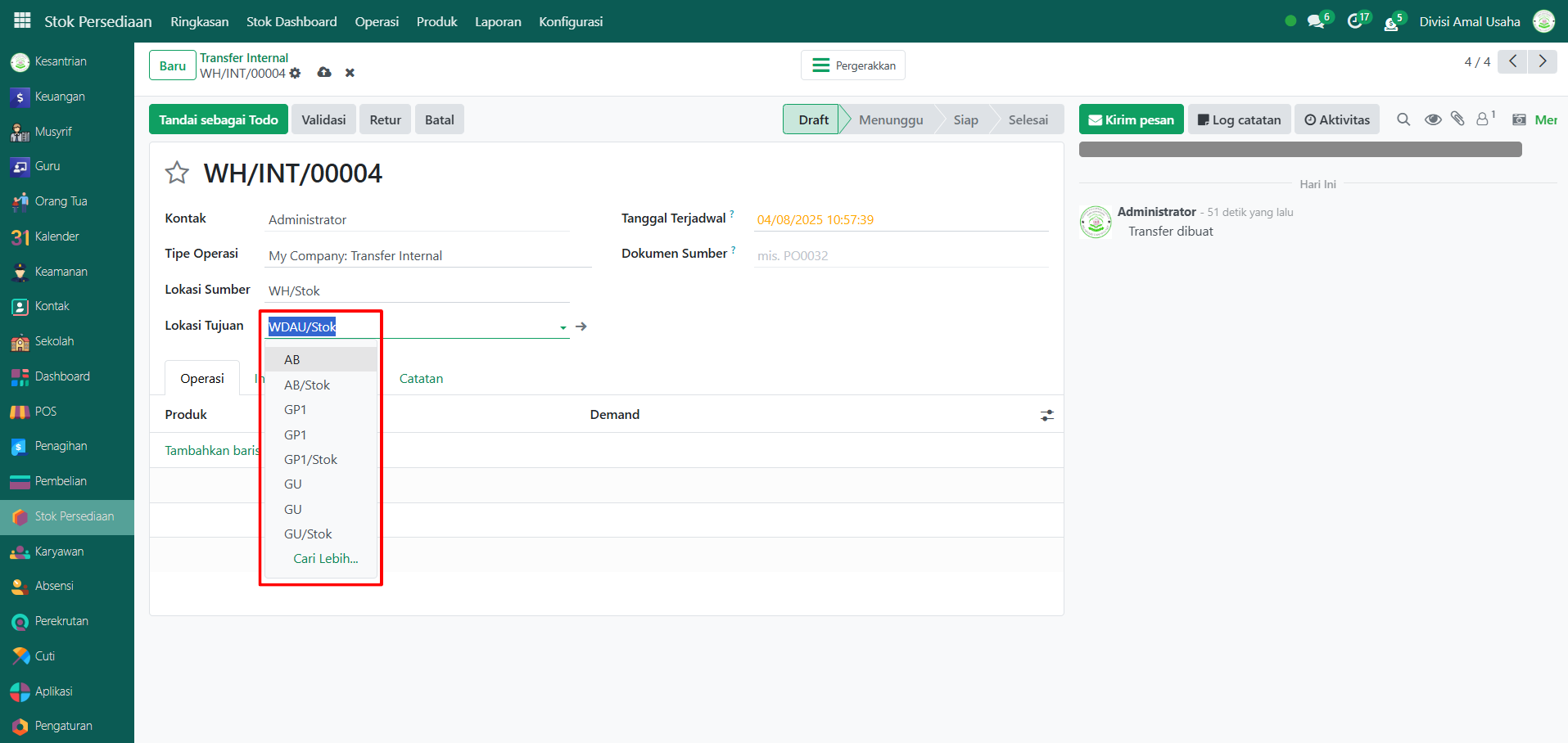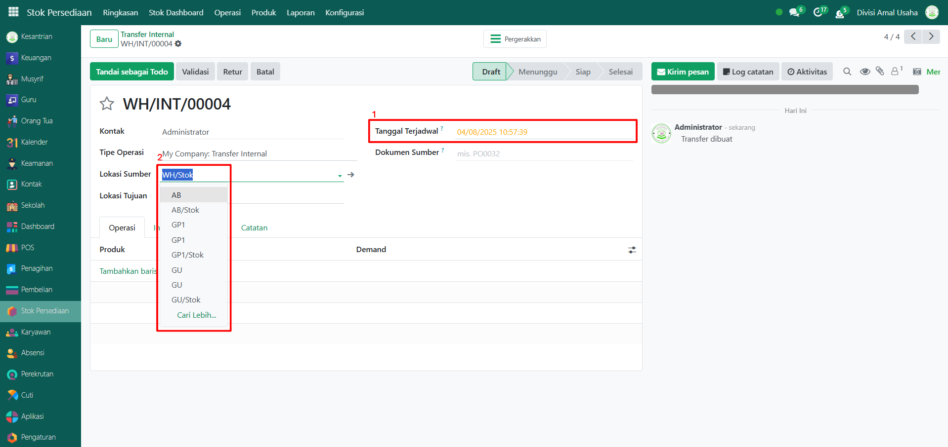 Operasi Internal digunakan untuk memindahkan barang antar lokasi di dalam gudang atau antar gudang dalam sistem Odoo Pesantren. Proses ini penting agar data stok tetap akurat sesuai dengan pergerakan barang yang terjadi di lapangan.
