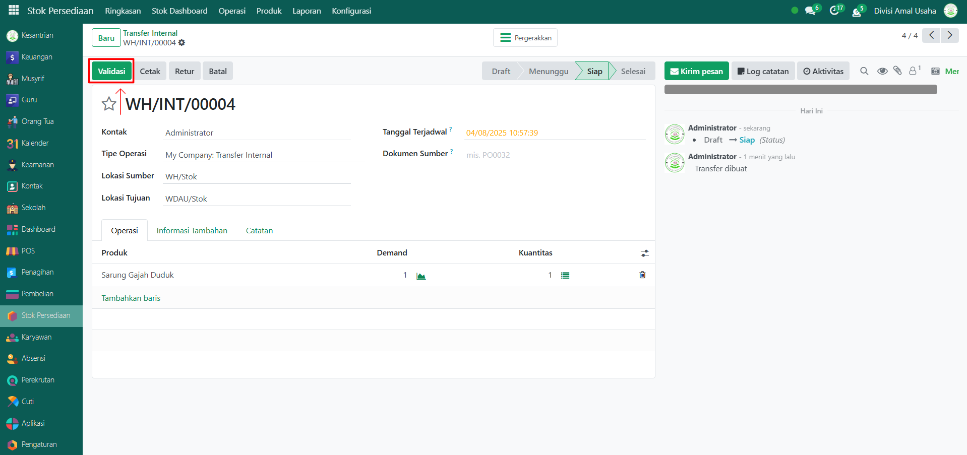Jika pemindahan barang sudah selesai dilakukan, klik tombol "Validasi" untuk mengonfirmasi bahwa operasi internal telah selesai.