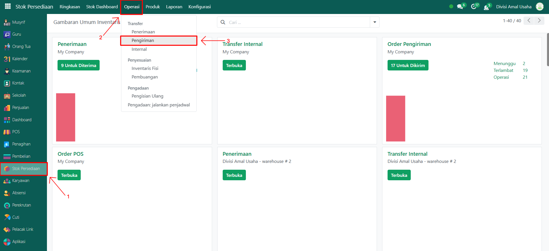 Buka modul Stok Persediaan, lalu pilih menu Operasi kemudian klik submenu Pengiriman.