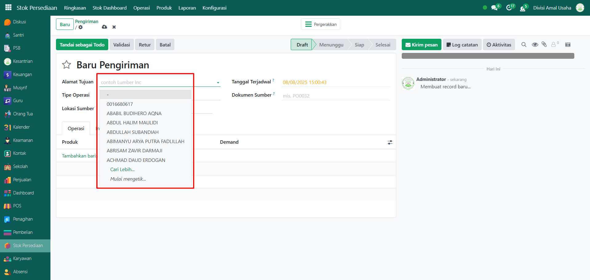 Berikut adalah langkah-langkah untuk melakukan proses pengiriman barang pada Odoo Pesantren.