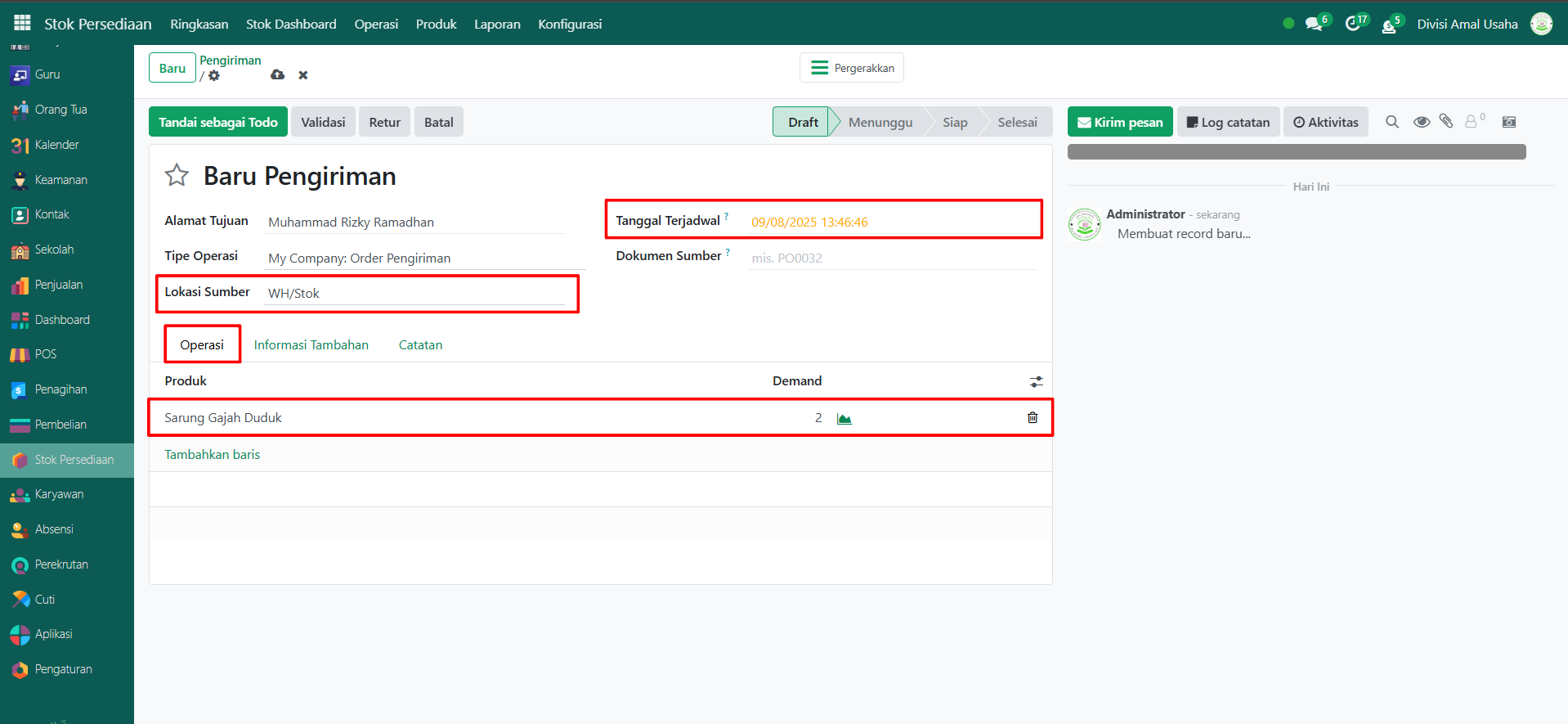 Pilih tanggal terjadwal dan lokasi sumber barang. Kemudian di Tab Operasi, tambahkan produk yang akan dikirim beserta kuantitas yang sesuai.
