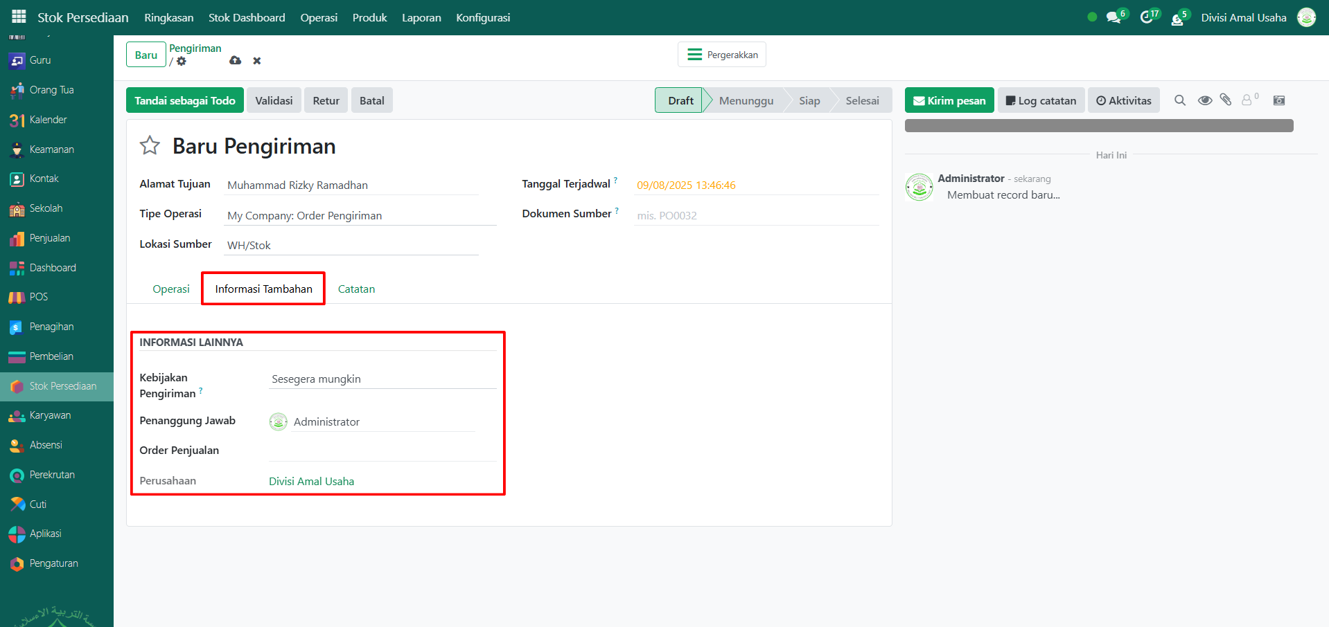 Pada Odoo Pesantren, proses pengiriman barang umumnya terjadi secara otomatis ketika transaksi penjualan dilakukan melalui modul Point of Sale (POS). Sistem akan langsung membuat dan memproses dokumen pengiriman tanpa perlu tindakan manual. Namun, dalam kondisi tertentu, pengguna dapat melakukan pengiriman barang secara manual, misalnya untuk pesanan penjualan di luar POS atau kebutuhan khusus lainnya.