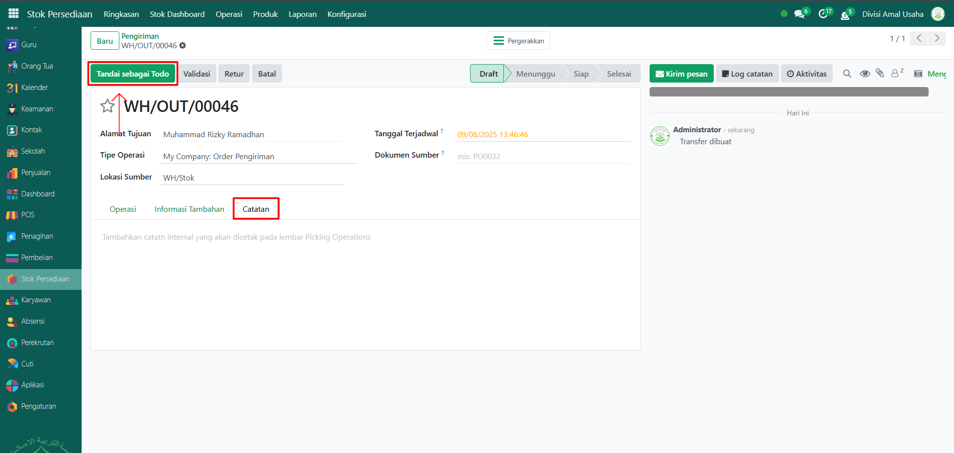 Jika diperlukan, buka Tab Catatan untuk menambahkan keterangan atau informasi penting terkait pengiriman. Setelah semua informasi terisi, klik tombol "Tandai sebagai Todo" untuk menandai bahwa pengiriman siap diproses.