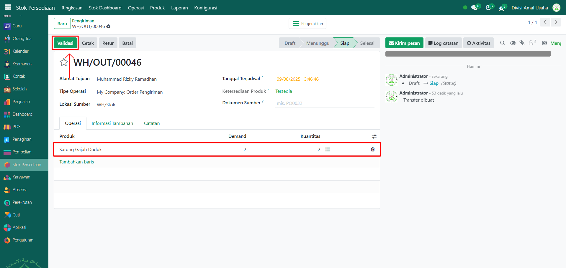 Kembali ke Tab Operasi dan pastikan produk, kuantitas, dan detail lainnya sudah benar. Lalu klik tombol "Validasi" untuk mengonfirmasi bahwa proses pengiriman barang telah selesai.