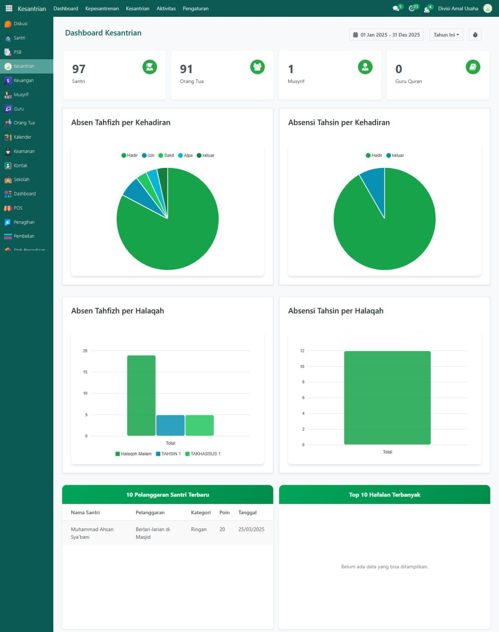 | 10 Pelanggaran Santri Terbaru | Menampilkan daftar santri yang dikenakan pelanggaran terbaru. |