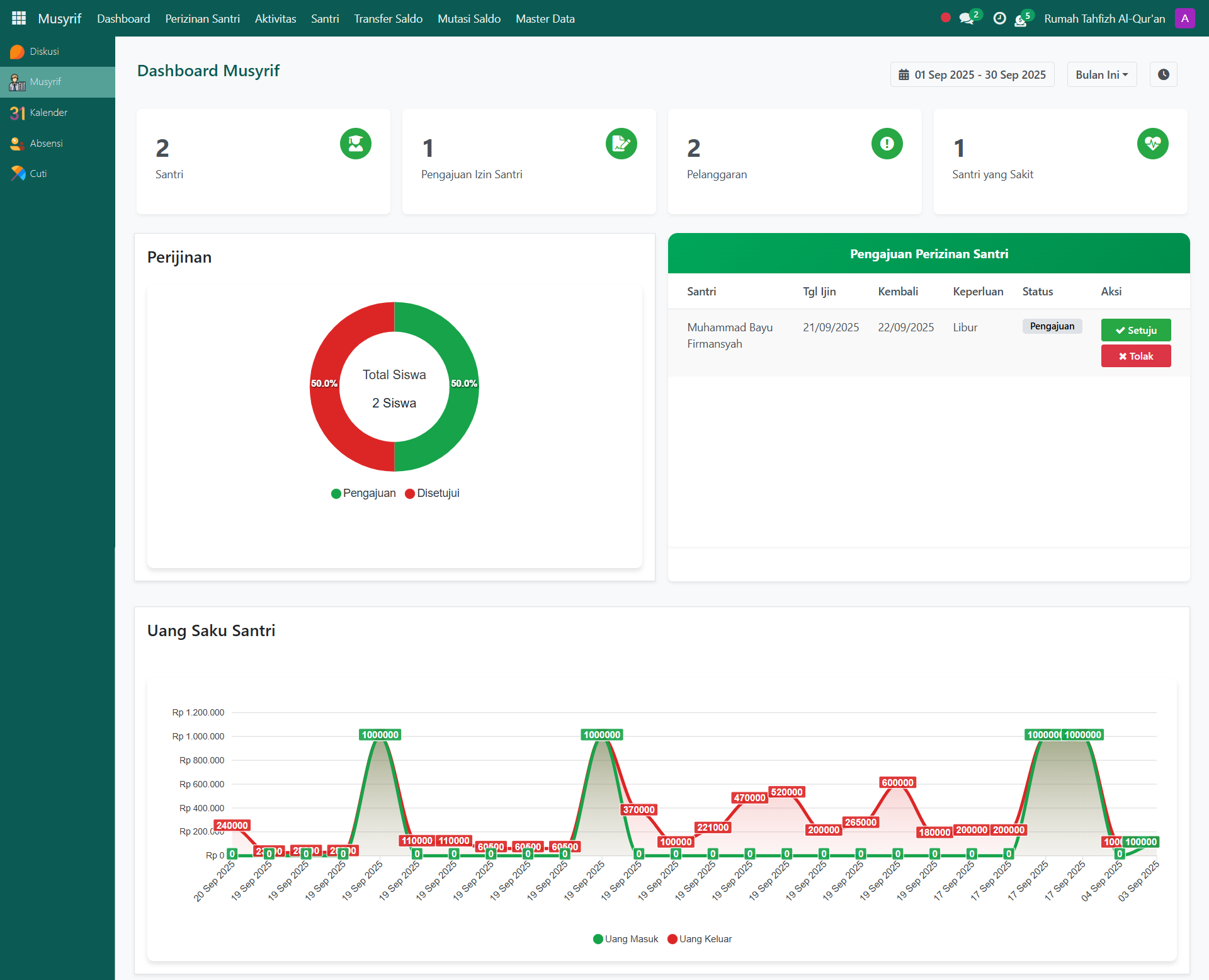 | Pengajuan Izin Santri | Menampilkan total pengajuan izin yang telah diajukan oleh orang tua kepada musyrif. |